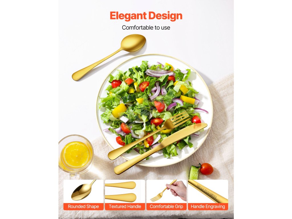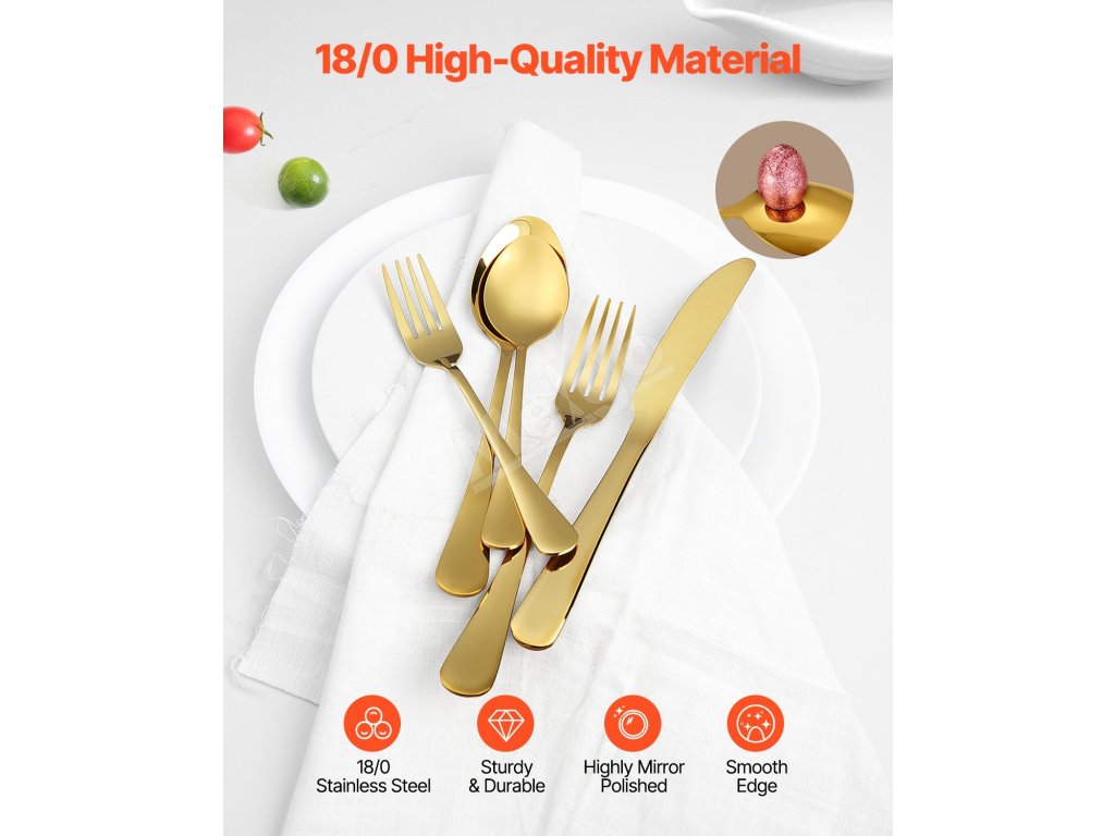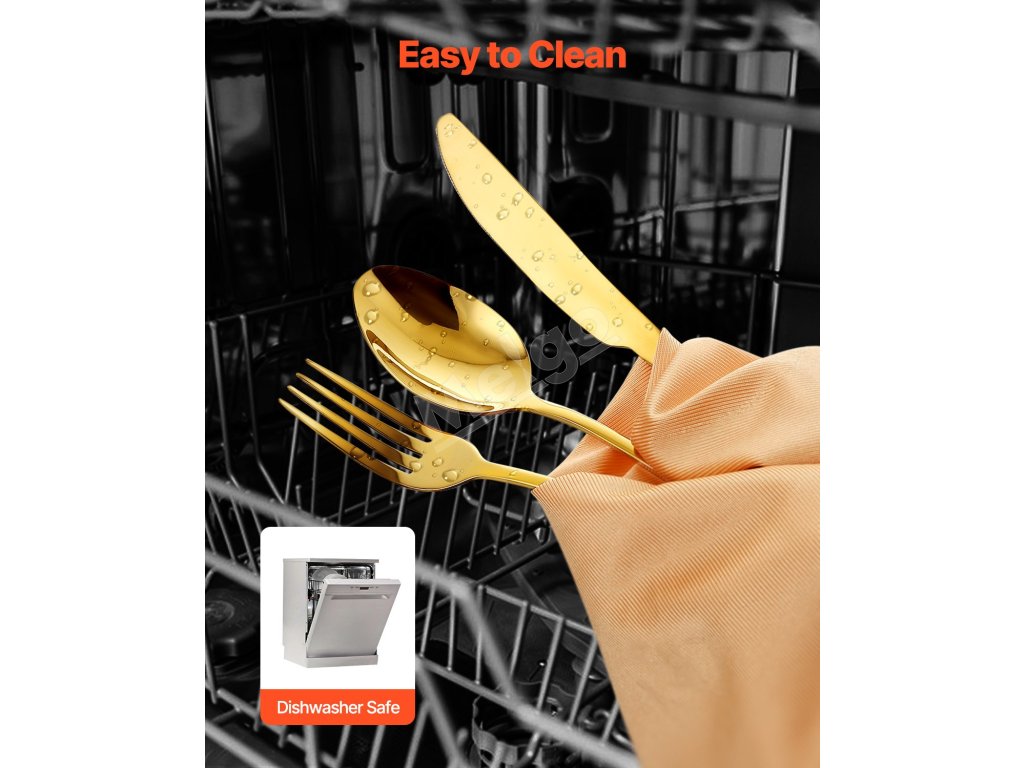 Táto súprava príborov je vyrobená z prvotriednej nehrdzavejúcej ocele 18/0, je odolná, nehrdzavejúca a dobre vyvážená. Dizajn s hladkými hranami poskytuje pohodlie počas používania. Dá sa umývať v umývačke riadu, má ideálnu hmotnosť a hrúbku na ľahkú manipuláciu, čo zaručuje dlhodobú životnosť.