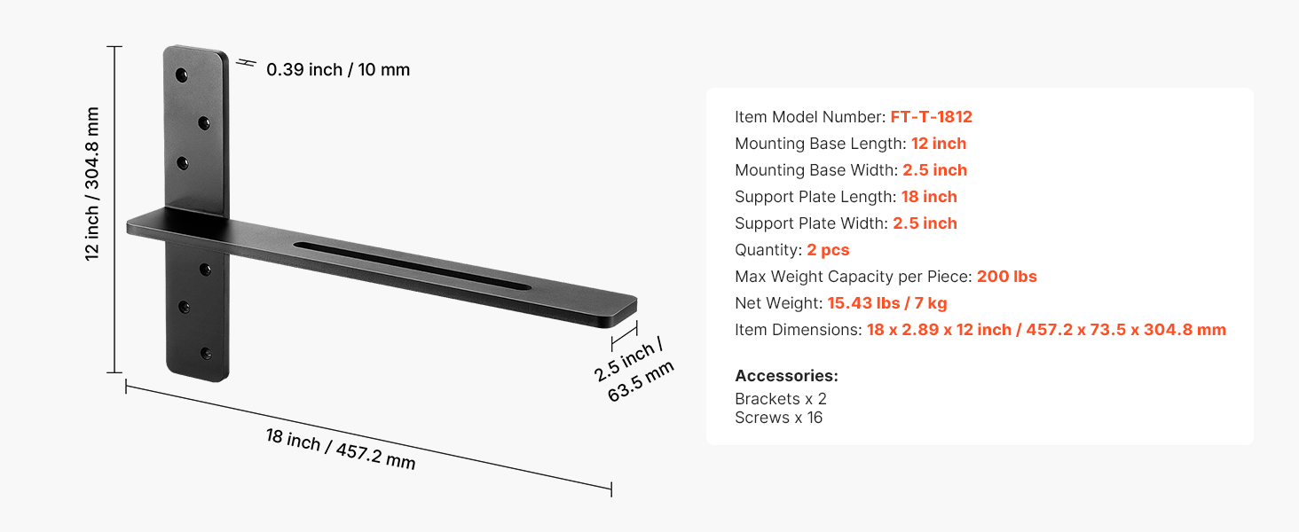 Držiaky políc 2 ks, nosnosť 200 lbs/90 kg, 457.2×73.5×304.8 mm