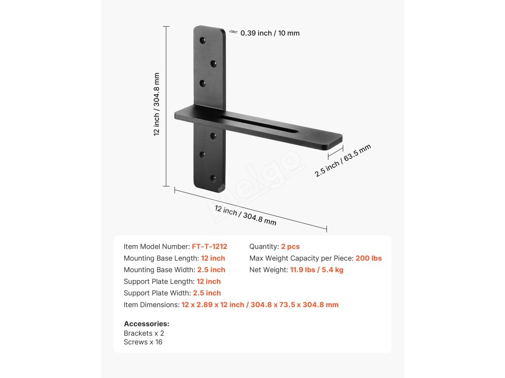 Konzola na poličku 2 ks, oceľová, nosnosť 90 kg, 304.8×73.5×304.8 mm