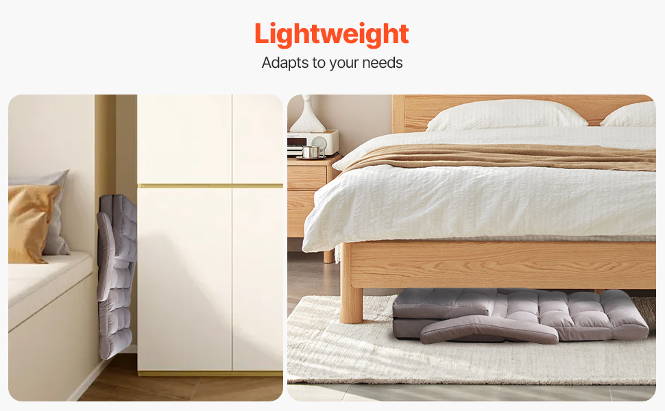 Toto skladacie podlahové kreslo je nielen skladacie na úsporné uskladnenie pri stene, ale po rozložení môže aj ležať na plocho, takže sa ľahko zmestí pod posteľ alebo pohovku bez toho, aby zaberalo ďalšie miesto. Vyhovuje potrebám rôznych používateľov na uskladnenie.