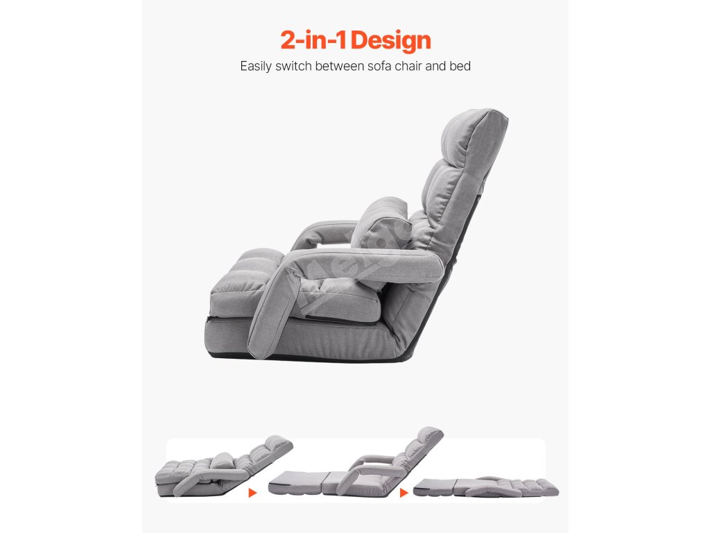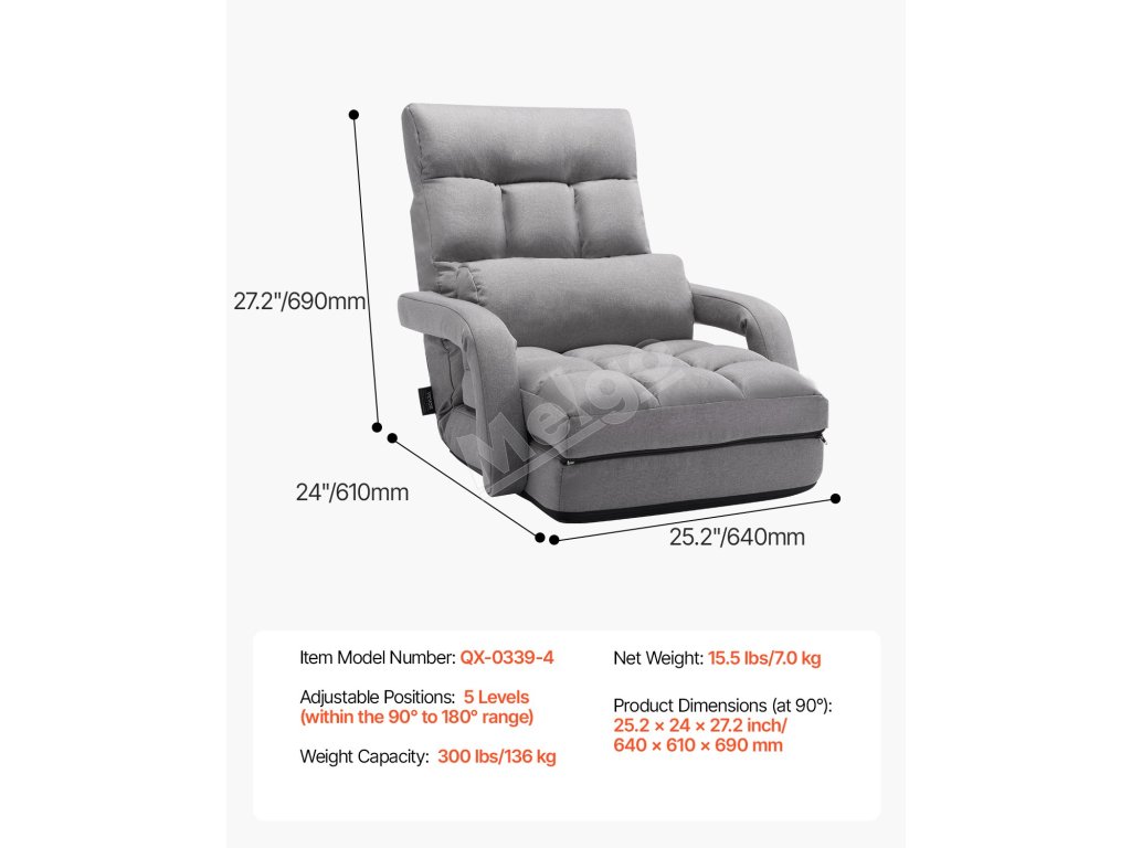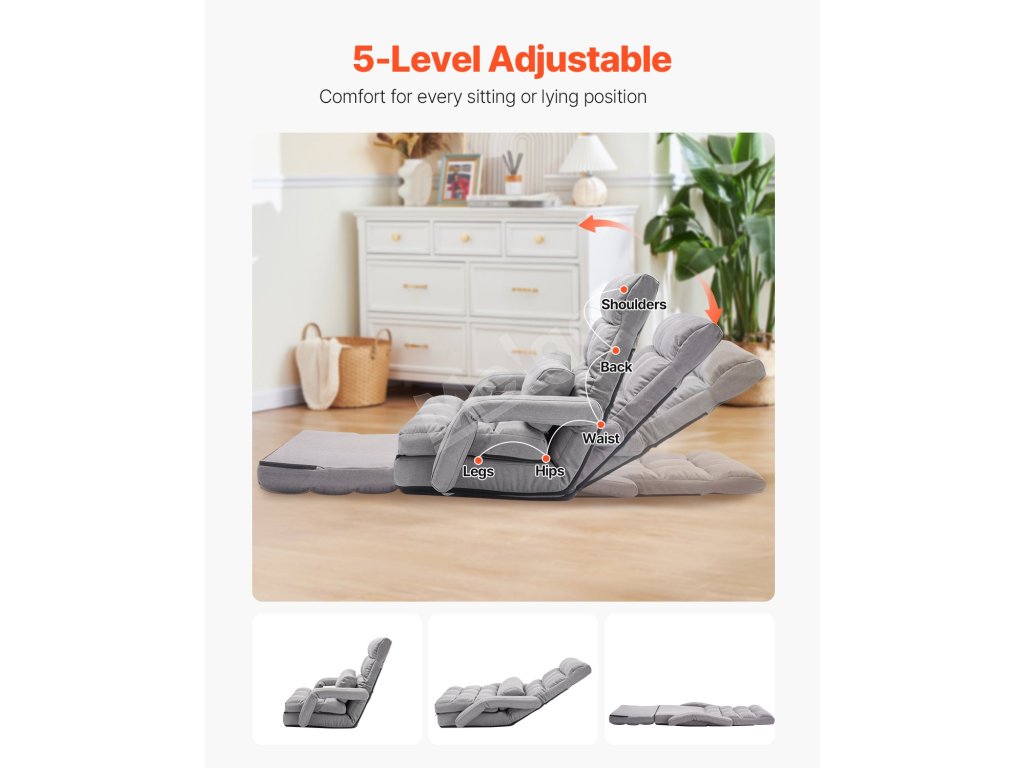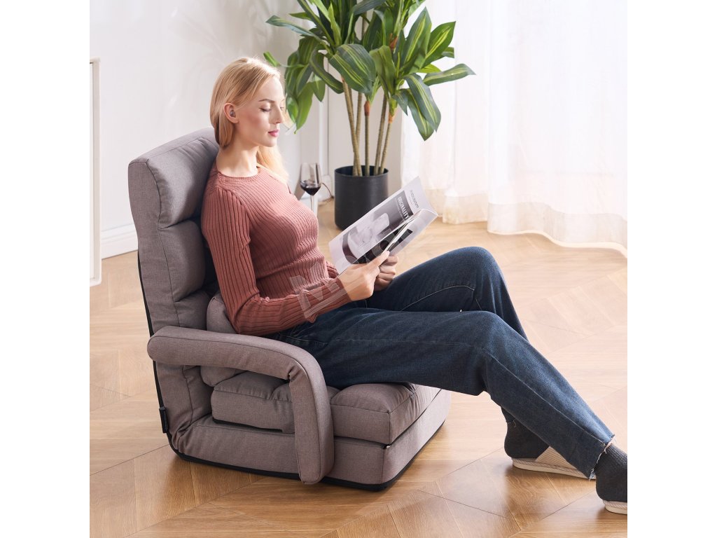 Podlahové skladacie kreslo, 5 polôh, opierka chrbta a opierky rúk, sivé