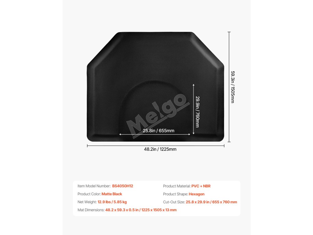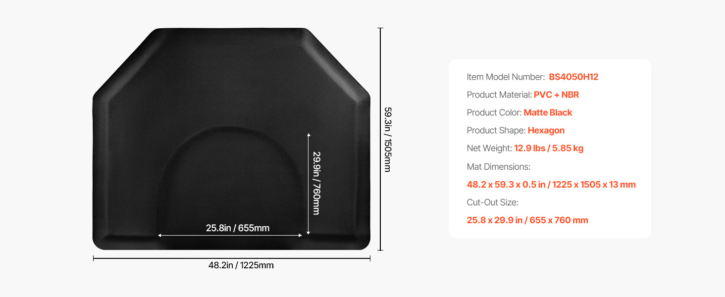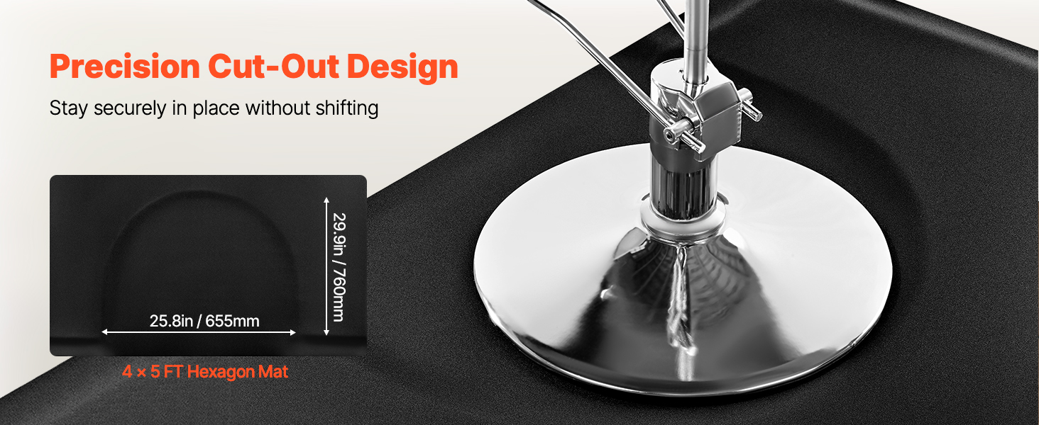 Naša šesťhranná rohož na stoličku do salónu s rozmermi 1225 x 1505 mm ponúka priestrannú plochu na státie, ktorá holičom umožňuje pracovať voľne a pohodlne. A výrez s rozmermi 655 x 760 mm (25,8 x 29,9 palca) je vhodný pre väčšinu salónnych kresiel s okrúhlou základňou. (Pred objednaním zmerajte základňu stoličky, aby ste sa uistili, že sa hodí)