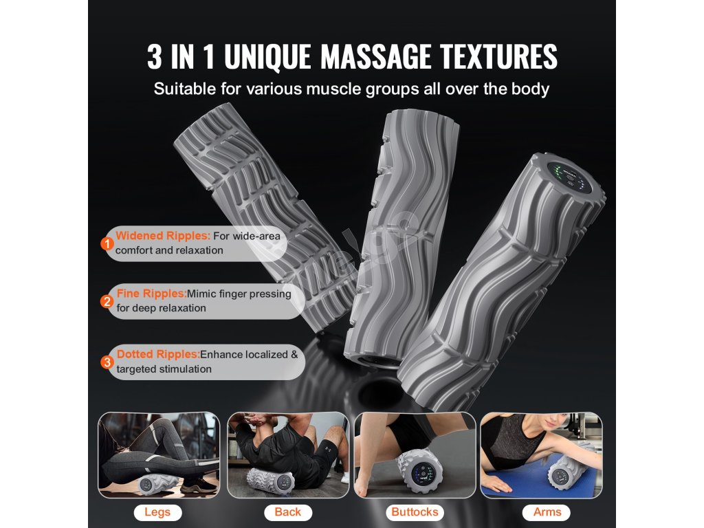 Vibračný valec 2 v 1 kombinuje 3D vlnové hnetenie s tlakom podobným tlaku prstov. Vlny pôsobia na veľké svaly, ako sú nohy a chrbát, zatiaľ čo textúra končekov prstov sa zameriava na menšie oblasti, ako sú ruky a krk, a prináša úľavu hlbokým tkanivám.