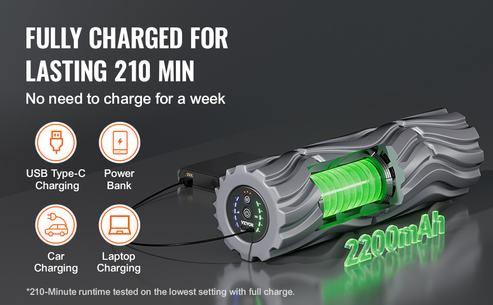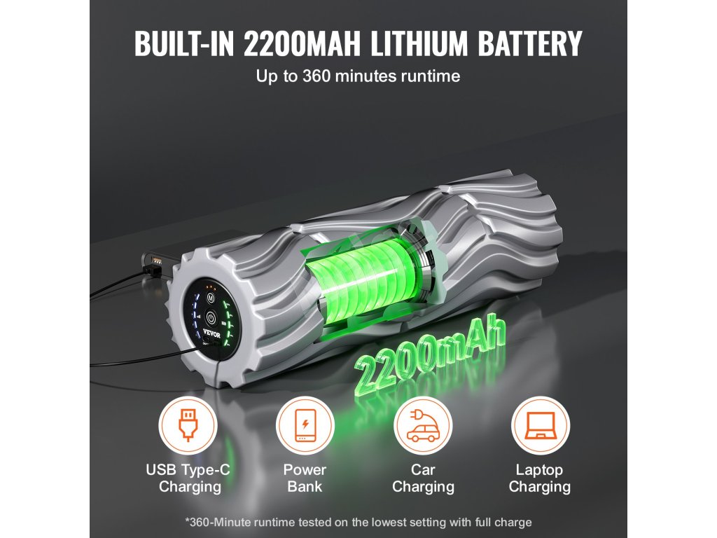 Tento elektrický penový valec využíva port USB typu C kompatibilný s powerbankami a notebookmi - už nemusíte loviť správnu nabíjačku. Batéria s kapacitou 2200 mAh vám zaručí dlhé a neprerušované masáže.