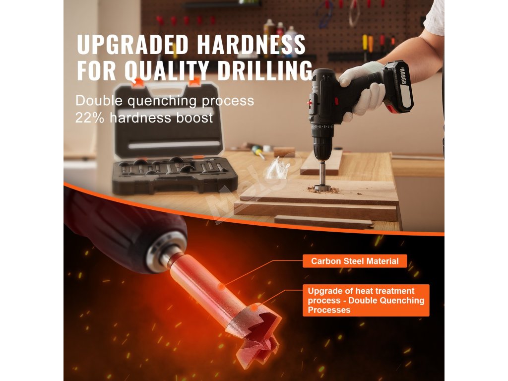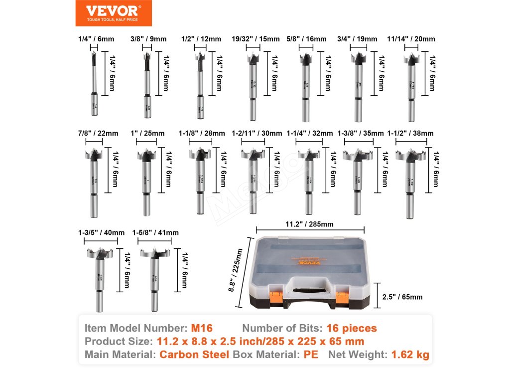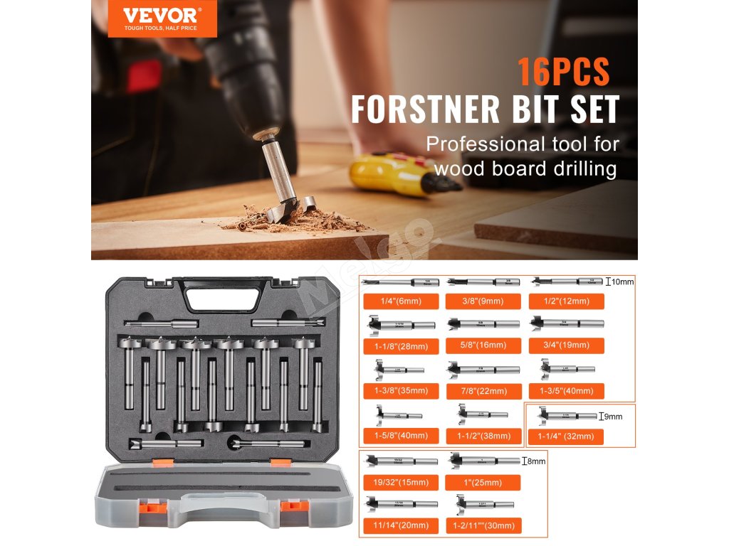 Sada forstnerových vrtákov 16 ks 6.4–41.3 mm uhlíková oceľ do dreva