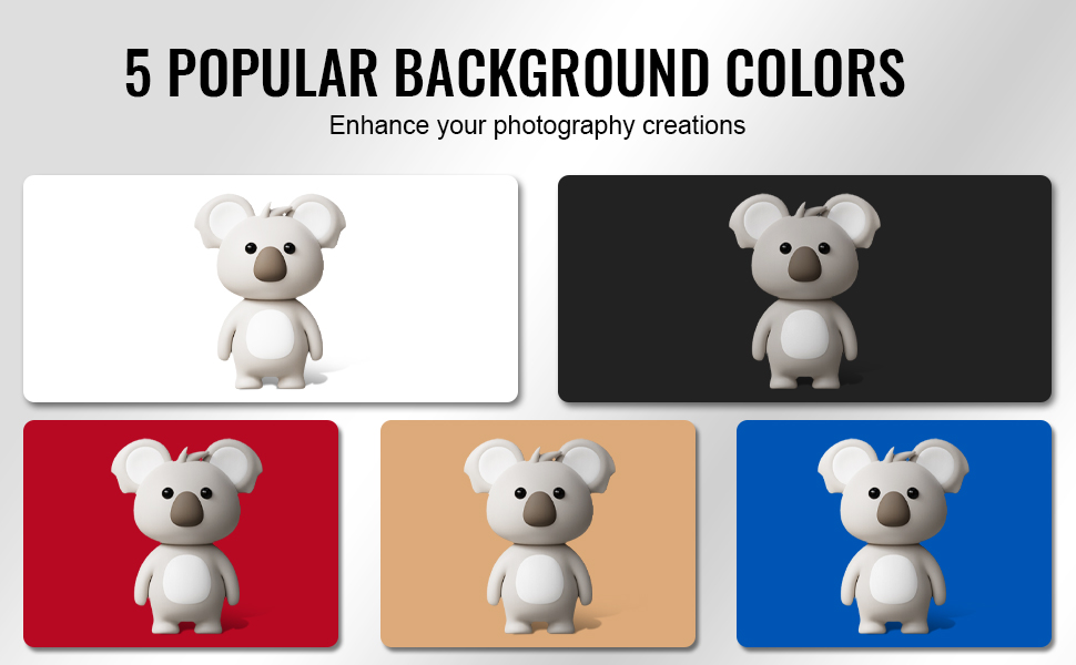 Zvýšte svoju kreativitu pomocou našich 5 odnímateľných pozadí (čierne/biele/oranžové/červené/modré). Bez námahy vytvárajte rôzne efekty pozadia a tematické štýly. Tieto pozadia sú vyrobené z vodoodolného PP materiálu, ľahko sa čistia, vymieňajú a sú odolné voči pokrčeniu, čím zvyšujú efektivitu vášho pracovného postupu.