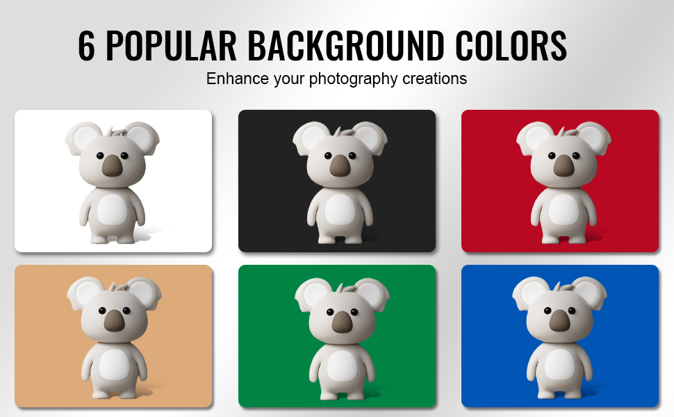 Zvýšte svoju kreativitu pomocou našich 6 odnímateľných pozadí (čierne/biele/oranžové/červené/zelené/modré). Bez námahy vytvárajte rôzne efekty pozadia a tematické štýly. Tieto pozadia sú vyrobené z vodoodolného PP materiálu, ľahko sa čistia, menia a sú odolné voči pokrčeniu, čím zvyšujú efektivitu vášho pracovného postupu.