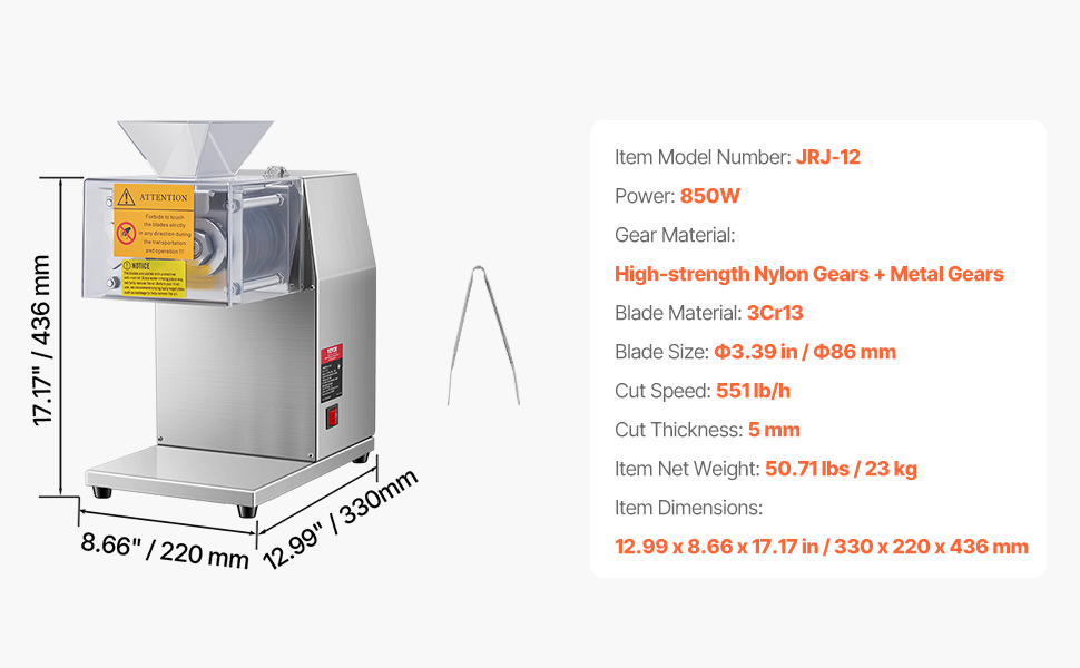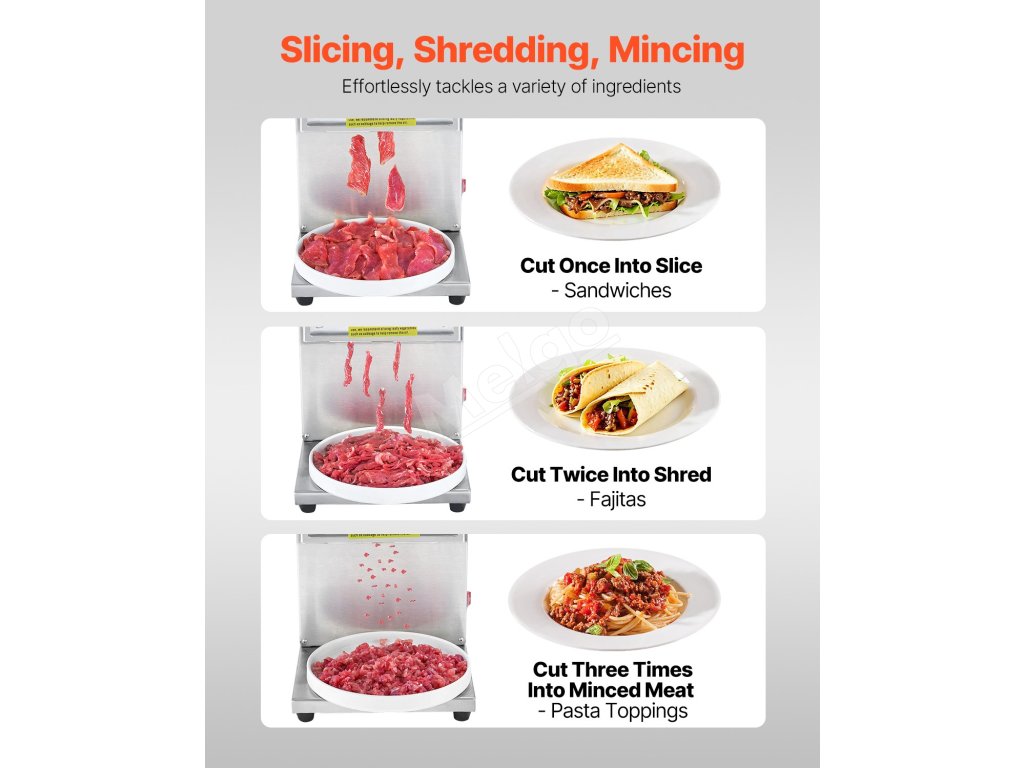 Vďaka hrúbke plátkov 5 mm vám náš komerčný krájač mäsa umožňuje ľahko krájať mäso na plátky, drviny alebo mleté mäso. Vysoká účinnosť znamená, že sa už nemusíte v kuchyni ponáhľať.