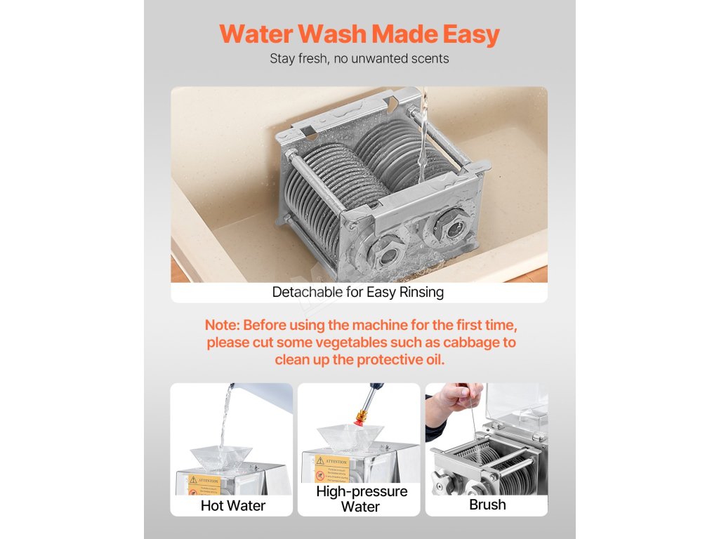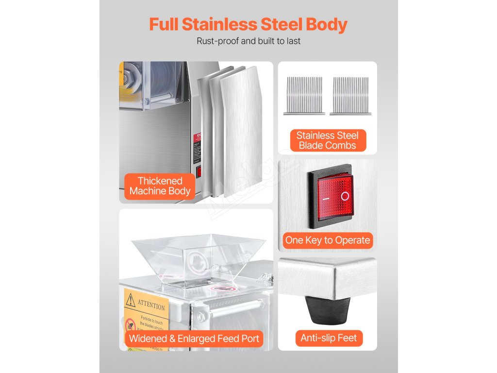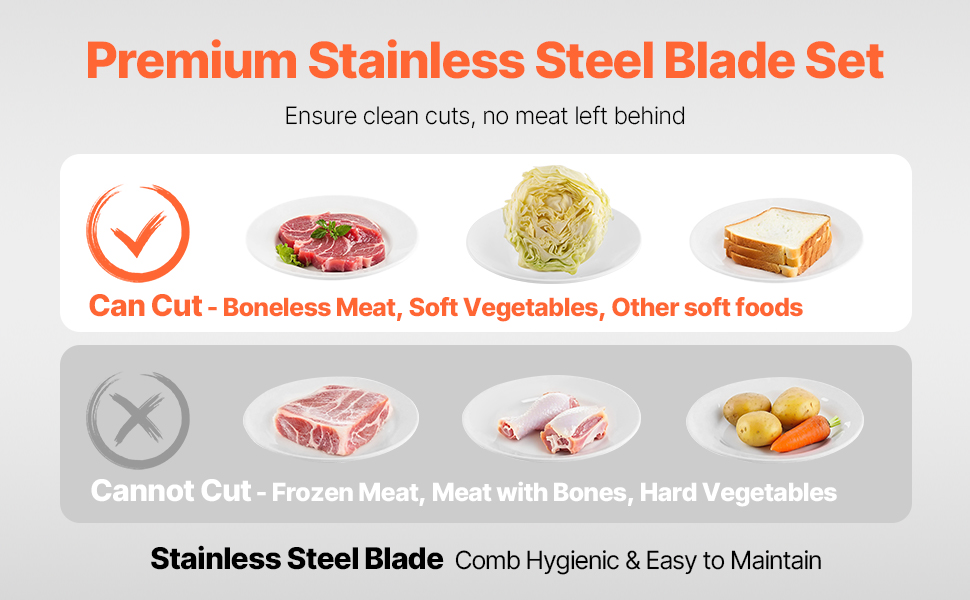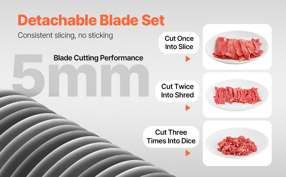 Náš komerčný krájač mäsa je vybavený vysokokvalitnou zostavou nerezových nožov, ktorá znižuje trenie pri krájaní a zabraňuje zaseknutiu. Efektívne skracuje šľachy, vďaka čomu budete mať zakaždým čisté, dobre nakrájané mäso. Čepele sú navyše odnímateľné, vďaka čomu môžete ľahko prepínať na rôzne veľkosti.