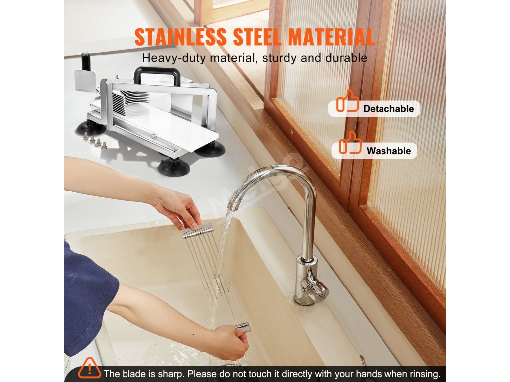 Súčasti čepele a hlavica sa dajú ľahko odpojiť. Všetky časti krájača na paradajky sú umývateľné, odolné proti korózii a trvanlivé.