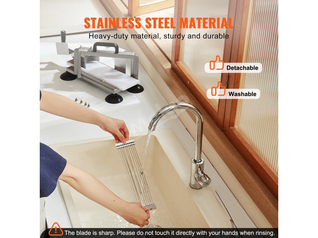 Súčasti čepele a hlavica sa dajú ľahko odpojiť. Všetky časti krájača na paradajky sú umývateľné, odolné proti korózii a trvanlivé.