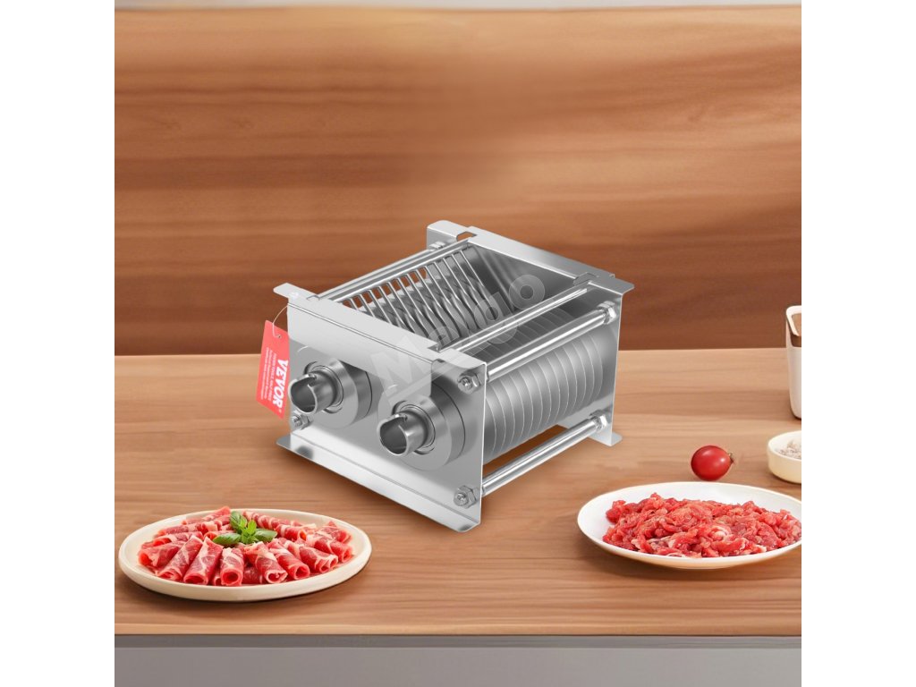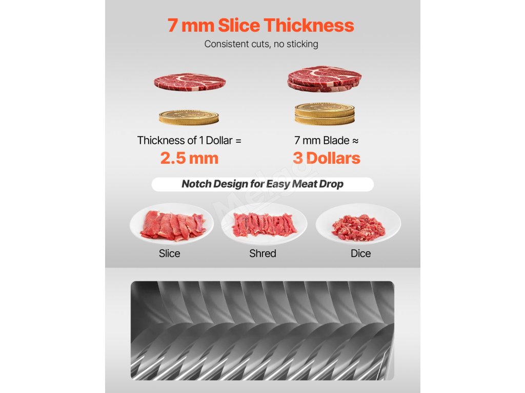 Vďaka hrúbke plátku 7 mm vám naša komerčná súprava nožov na krájanie mäsa umožňuje ľahké krájanie mäsa na plátky, drvenie alebo mleté mäso. Vysoká účinnosť znamená, že sa už nemusíte v kuchyni ponáhľať.