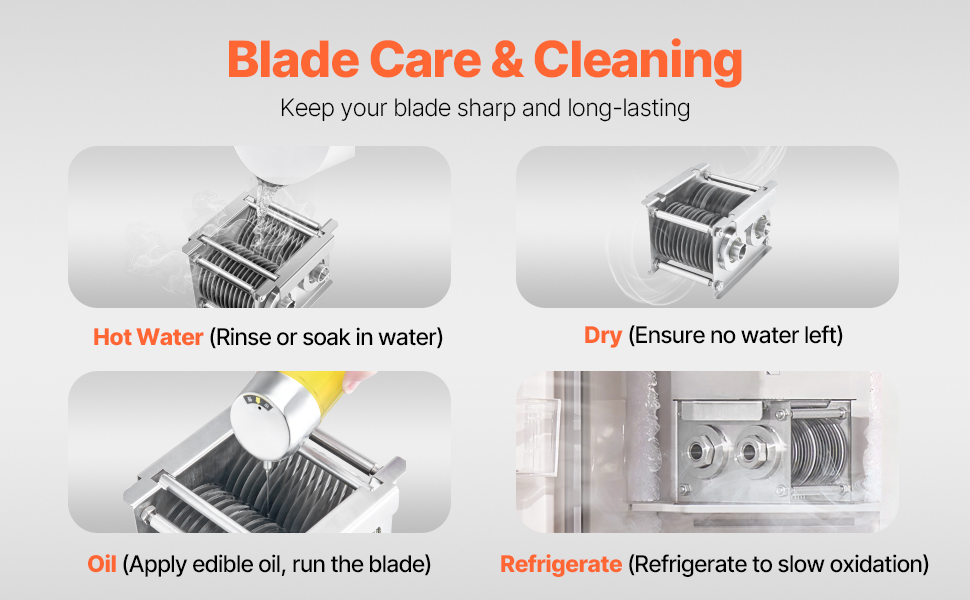 Keď je čepeľ pre stroj na krájanie mäsa chvíľu nečinná, môžete si všimnúť mierny nános. Je to normálne. Stačí naniesť trochu potravinárskeho oleja a nakrájať niekoľko plátkov zeleniny, aby všetko zostalo v skvelom pracovnom stave.