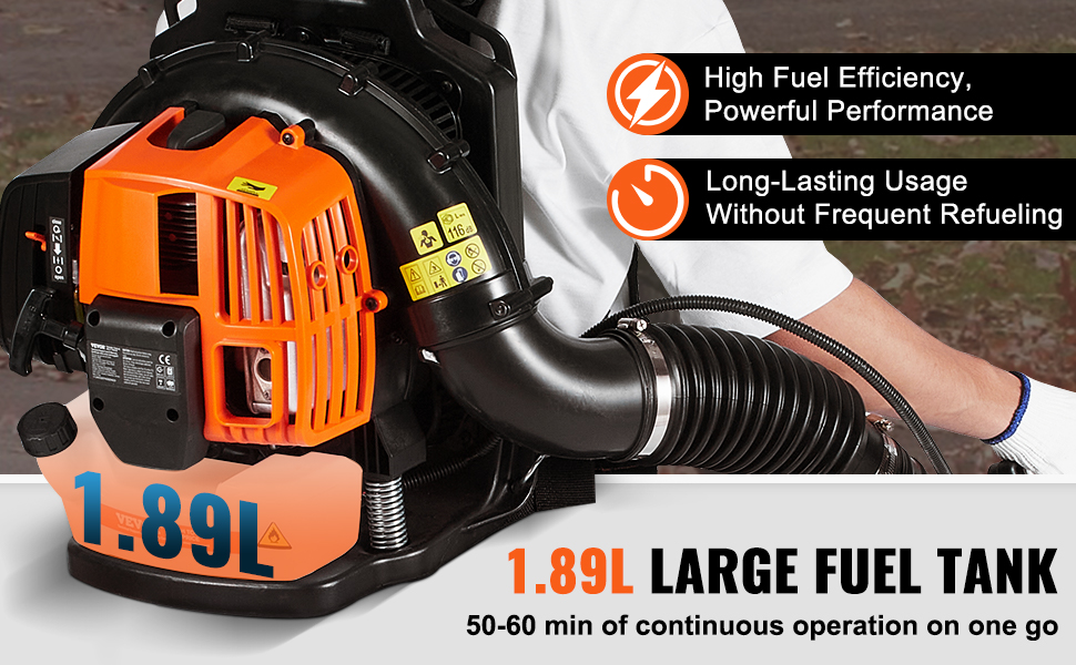 Batohový fúkač lístia 63CC 2-taktný, 1.89L nádrž, 1110CFM, 220MPH