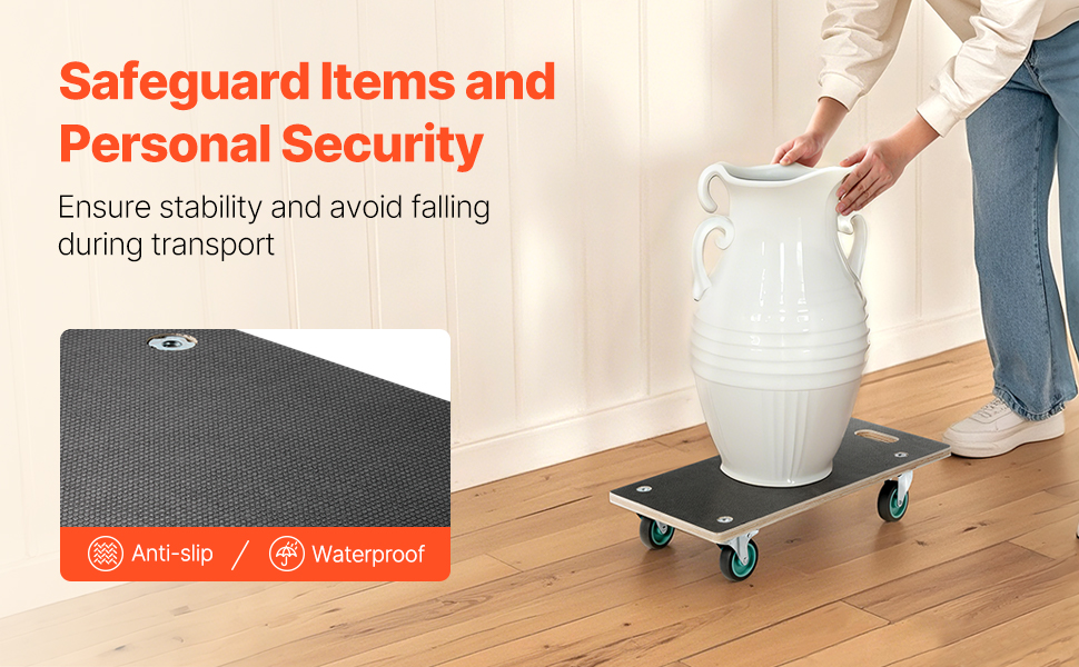 Žiadne šmýkanie ani posúvanie sa tu nekoná! Protišmykový, vodeodolný povrch nášho vozíka na sťahovanie nábytku udrží vaše predmety na mieste, vďaka čomu budete mať istotu, že všetko zostane počas prepravy v bezpečí.