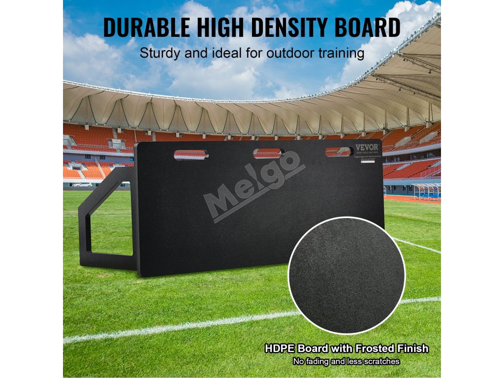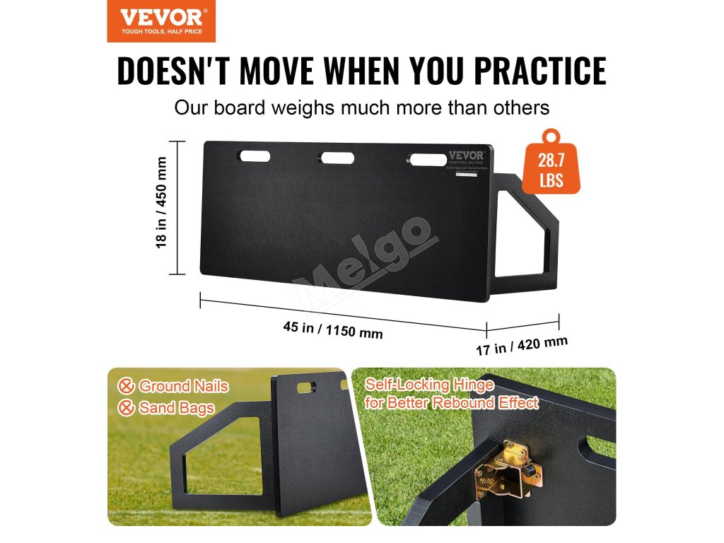 Naša futbalová doska má rozmery 45" x 18" x 17" a váži 28,7 kg. Je dostatočne ťažká na to, aby stabilne stála pri každom údere - na väčšiu stabilitu nepotrebujete klince do zeme ani vrecia s pieskom.
