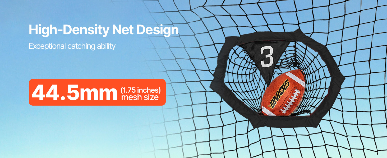 Táto futbalová hádzacia sieť s konštrukciou s vysokou hustotou a veľkosťou otvorov 1,75 palca/44,5 mm zabezpečuje kompatibilitu s cvičeniami na prihrávanie.