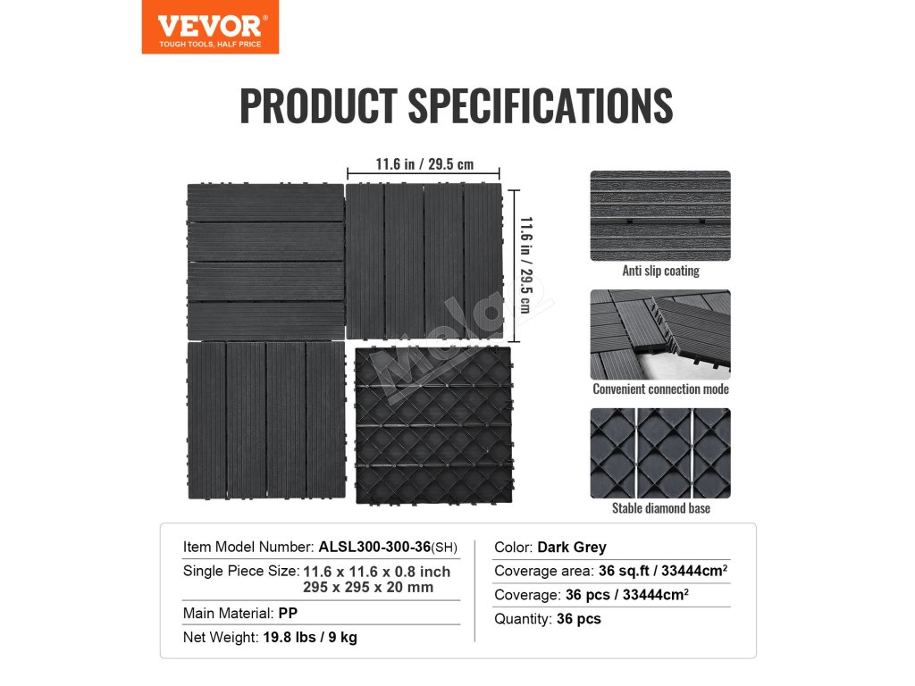 | Veľkosť jedného kusu | 11.8 x 11,8 x 0,8 palca / 300 x 300 x 20 mm |