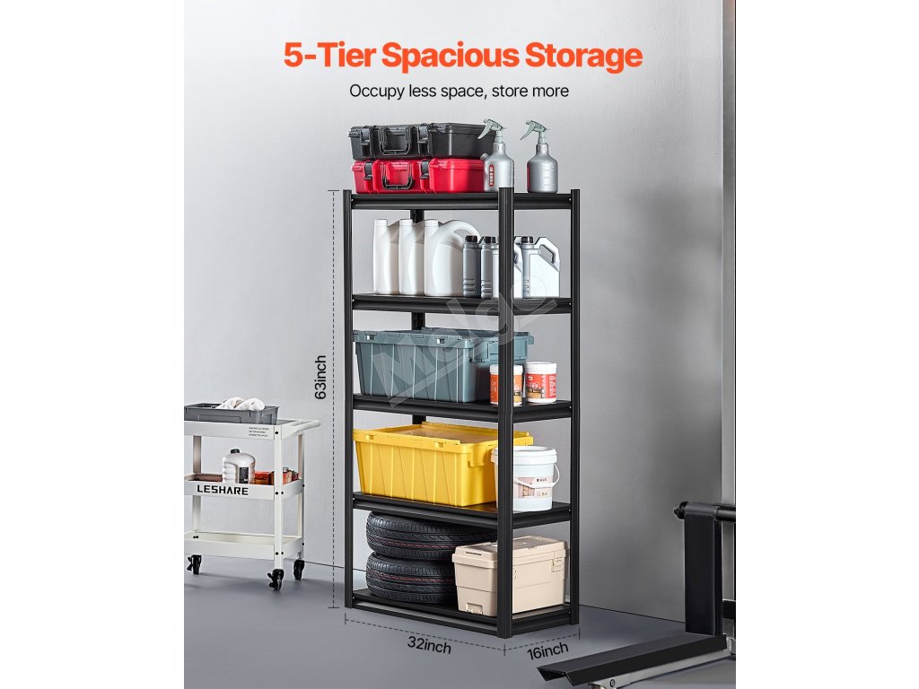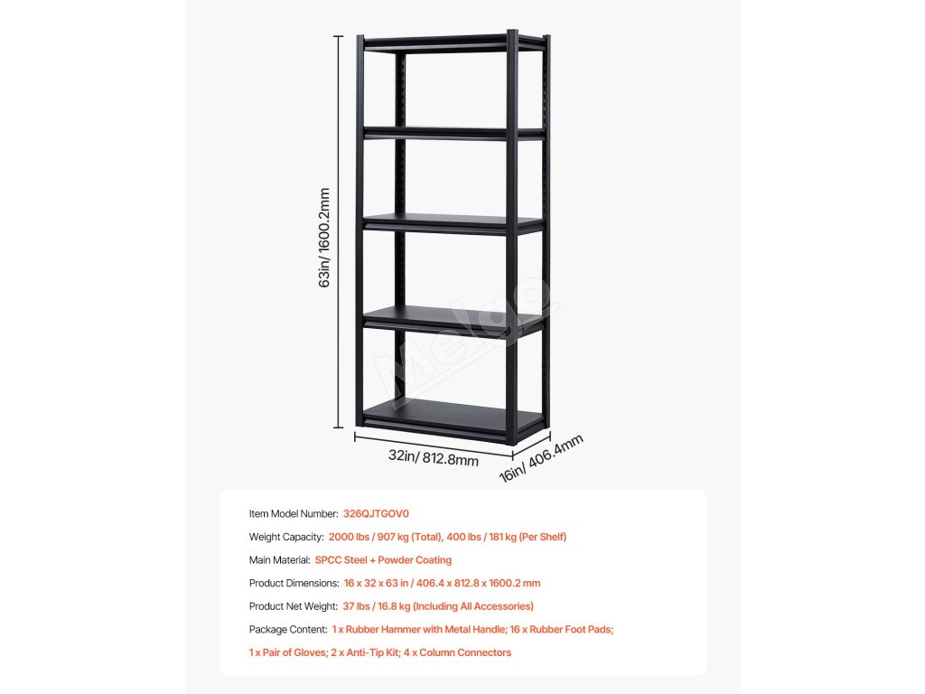 Policový regál, nosnosť 2000 lbs, 5 políc, 16" d × 32" w × 63" h