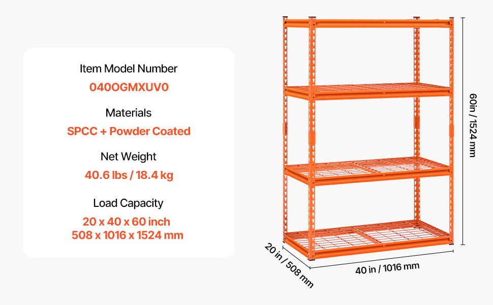 Policový regál 4 úrovne, 2400 lbs, nastaviteľný, 20" D × 40" W × 60" H