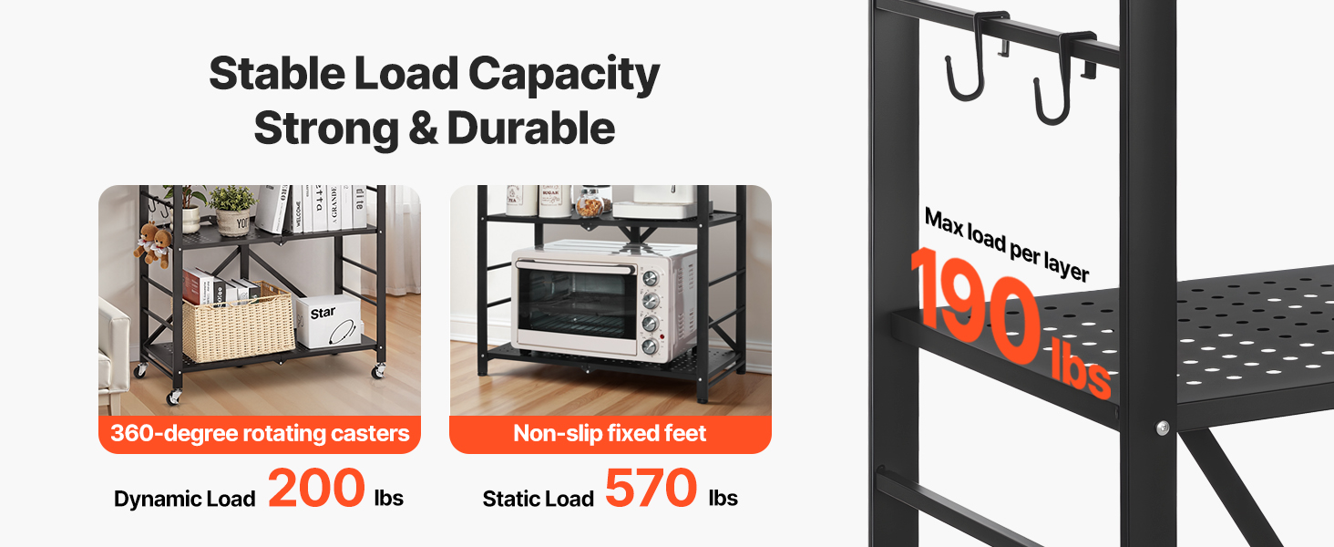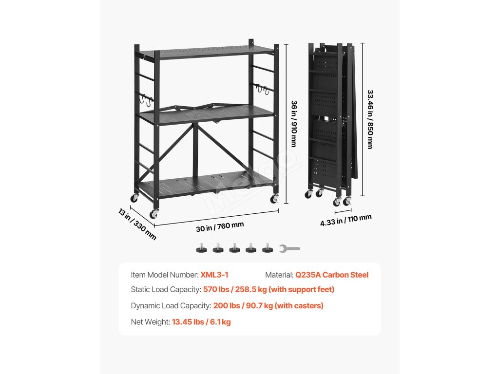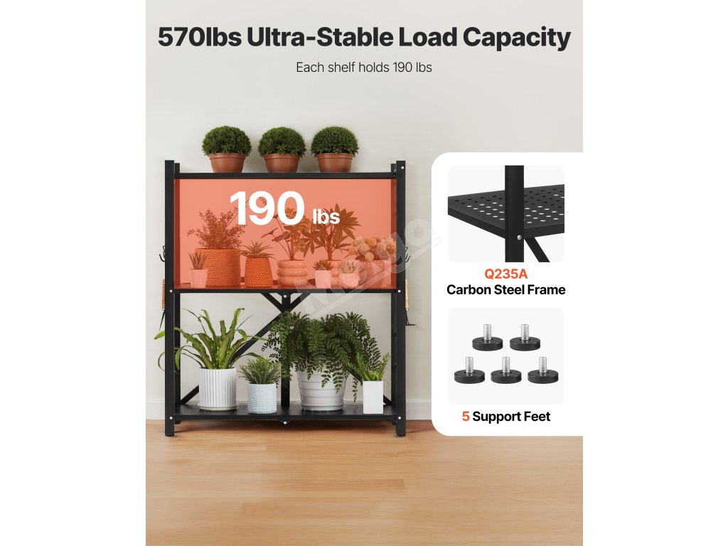 Každá vrstva unesie až 190 kg. Viacúrovňová konštrukcia skladacieho regálu udržiava predmety prehľadné a roztriedené. Skvele sa hodí do kúpeľne, kuchyne, kancelárie alebo garáže - čokoľvek potrebujete uskladniť!