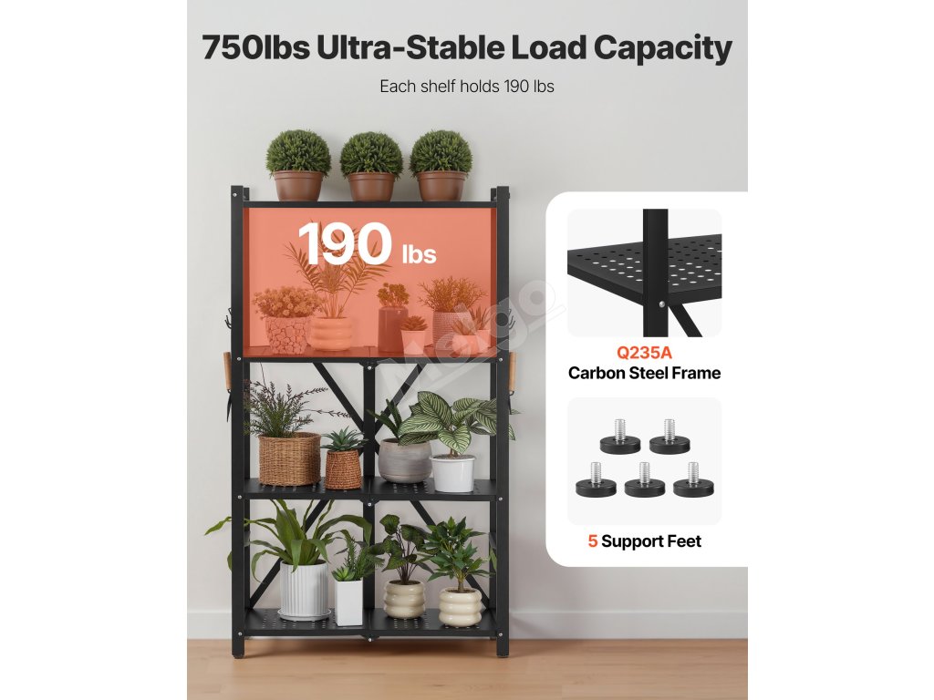 Každá vrstva unesie až 190 kg. Viacúrovňová konštrukcia skladacieho regálu udržiava predmety prehľadné a roztriedené. Skvele sa hodí do kúpeľne, kuchyne, kancelárie alebo garáže - čokoľvek potrebujete uskladniť!