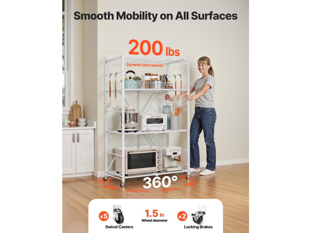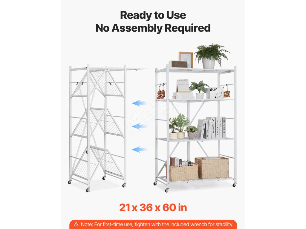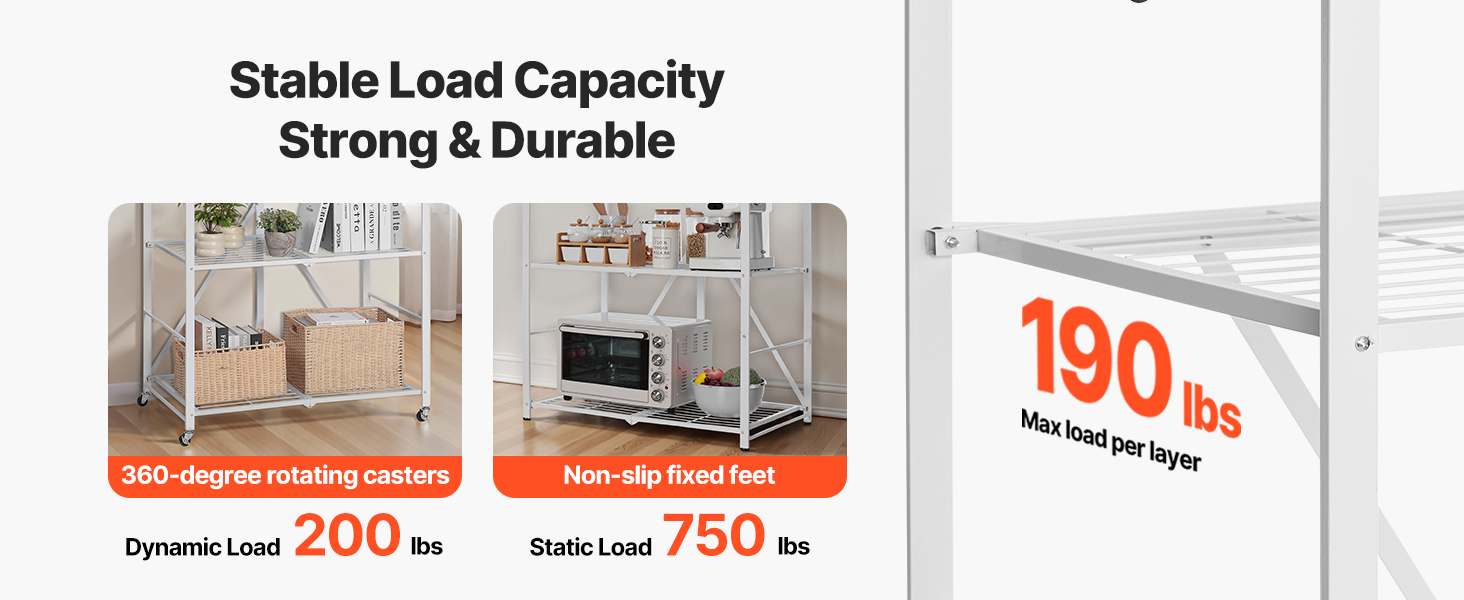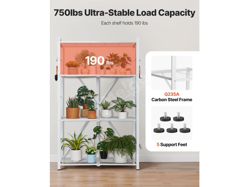 Každá vrstva unesie až 190 kg. Viacúrovňová konštrukcia skladacieho regálu udržiava predmety prehľadné a roztriedené. Skvele sa hodí do kúpeľne, kuchyne, kancelárie alebo garáže - čokoľvek potrebujete uskladniť!