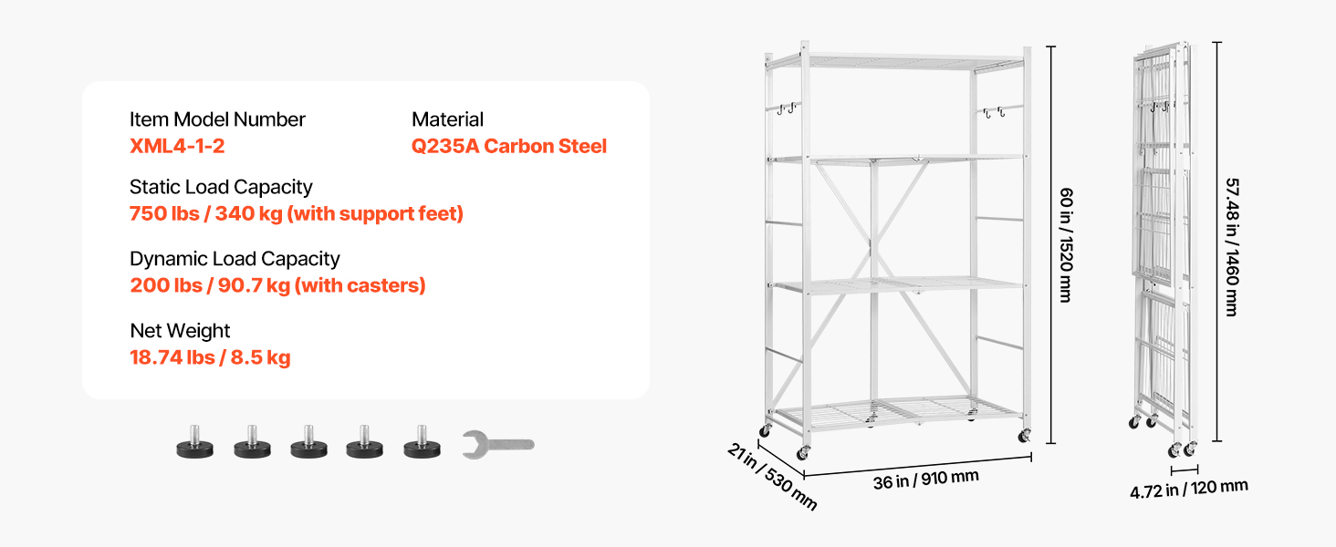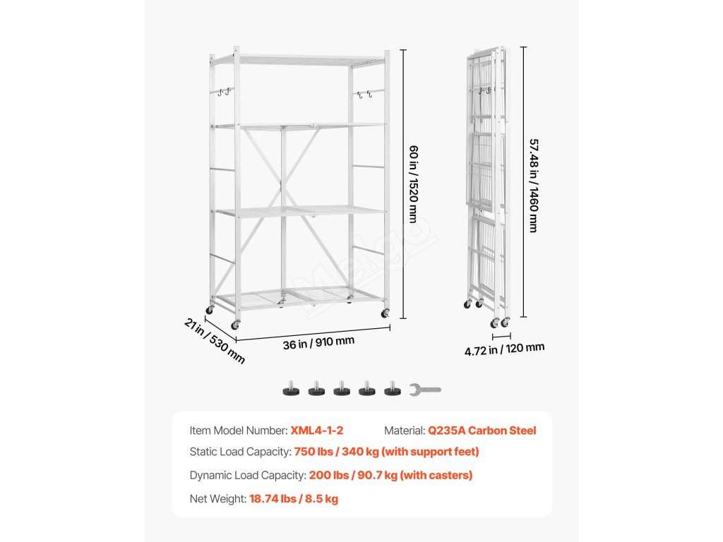 Tento skladací regál vyrobený z uhlíkovej ocele Q235A unesie až 750 kg s kolieskami a 200 kg v režime oporných nožičiek. Vymeniteľné nožičky a kolieska vám poskytujú odolnosť a všestrannosť!