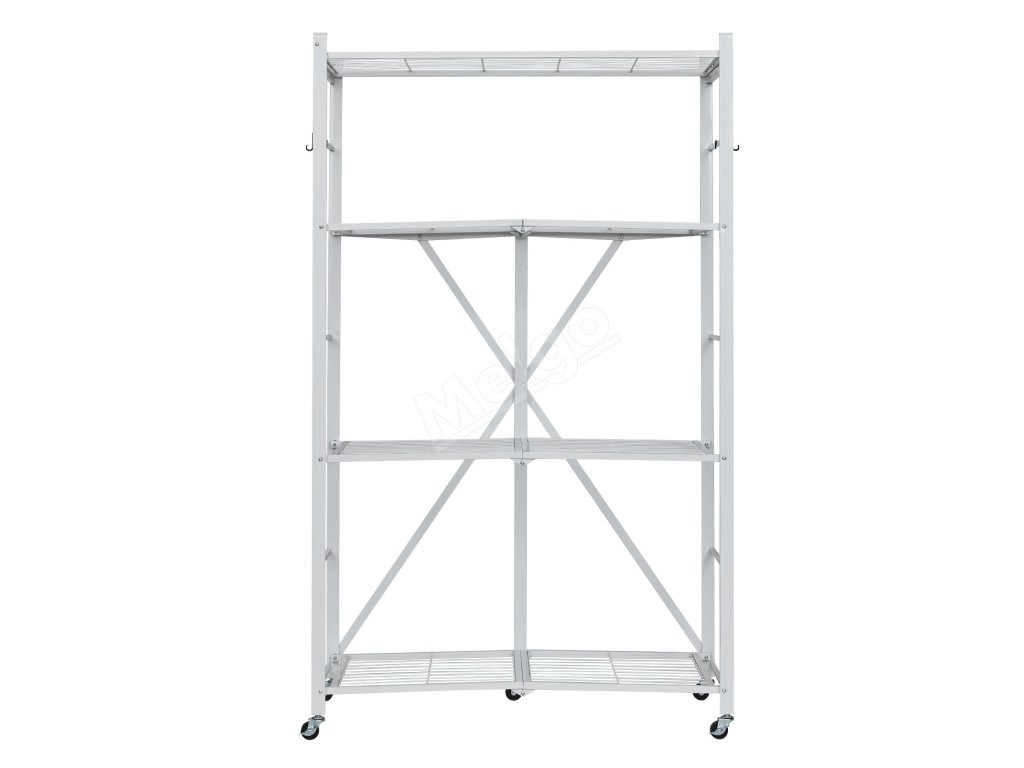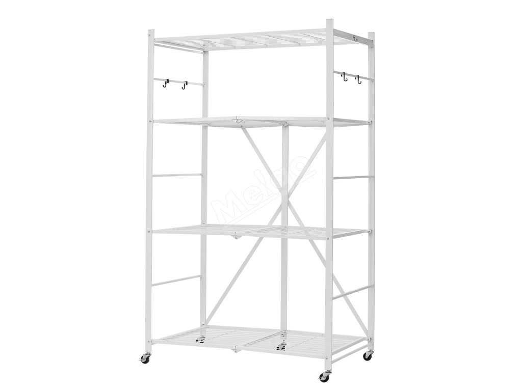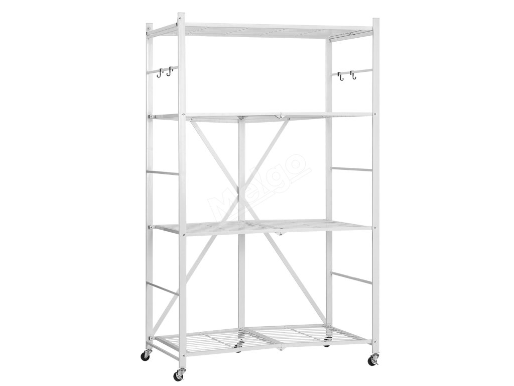 Skladací regál 4 police 36×21×60 inch, 5 koliesok, 4 háčiky, biely