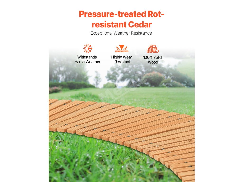 Tento drevený záhradný chodník je krásny a zároveň praktický, zabraňuje vzniku blata a zároveň poskytuje stabilitu. Je vyrobený z tlakovo ošetreného cédra a má protišmykovú konštrukciu na zaistenie bezpečnosti. Je ideálny pre záhrady, terasy a zhromaždenia, ľahko sa skladuje a je ideálny pre rôzne vonkajšie prostredie.
