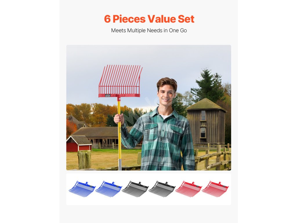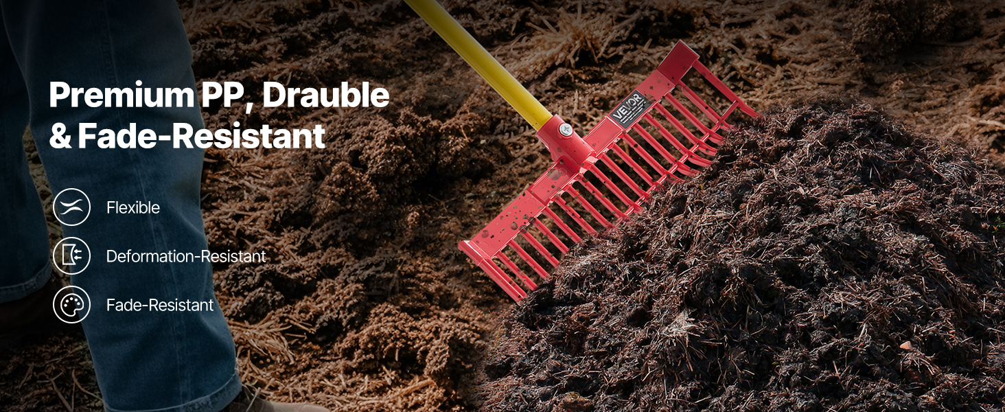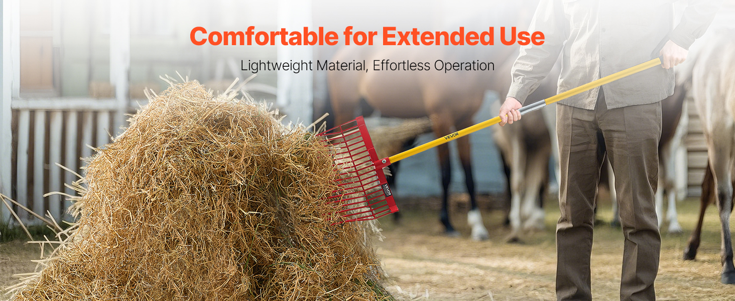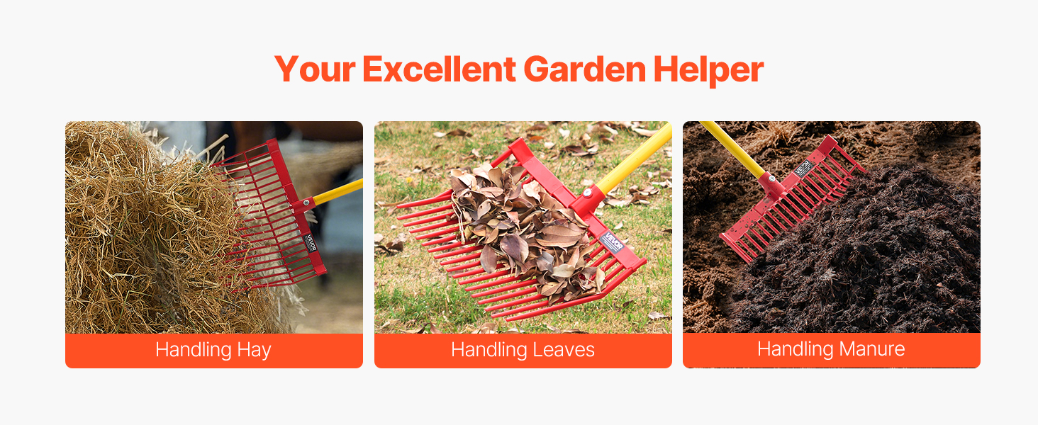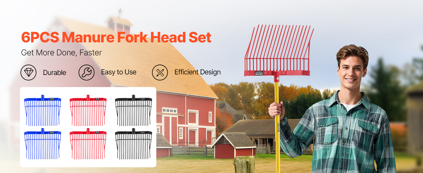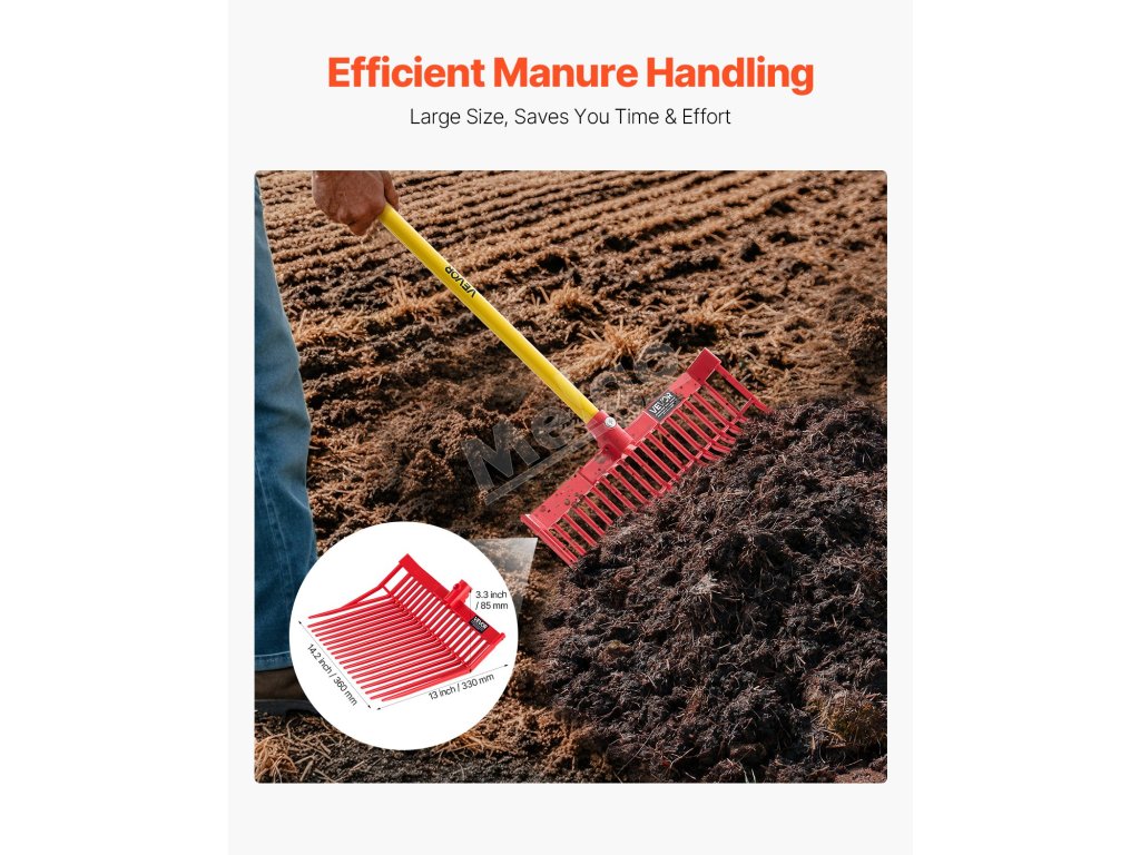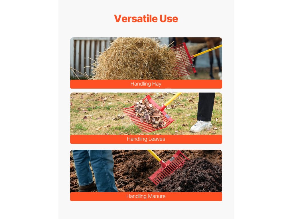 Táto hnojová hlava je kompatibilná s drevenými, kovovými alebo vláknitými násadami a je ideálna na manipuláciu s veľkými hromadami lístia, borovicového ihličia, mulča, drevnej štiepky, hnoja a sena. Nie je však vhodná na prekopávanie.