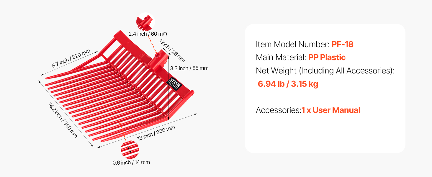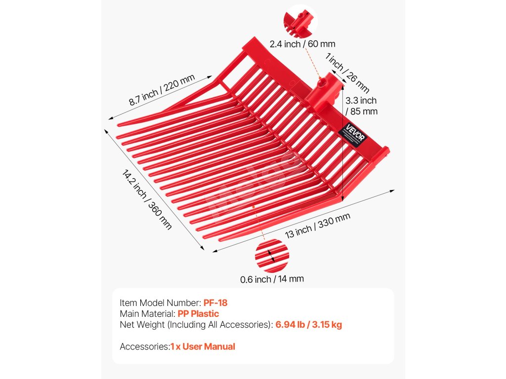 Naše náhradné hlavice na vidly na seno sú vyrobené z vysokokvalitného PP plastu a ponúkajú ľahkú, ale odolnú konštrukciu, ktorá zabraňuje únave pri dlhodobom používaní. Každá hlava vidlí je vedecky navrhnutá pre silnú silu uchopenia, vďaka čomu je manipulácia so senom, slamou a inými materiálmi jednoduchá a efektívna.