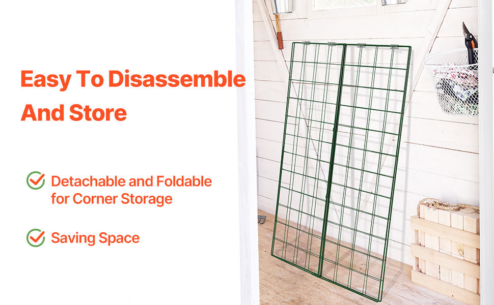 Keď sa táto vertikálna mriežka na uhorky nepoužíva, dá sa ľahko rozložiť a zložiť na plocho na pohodlné a kompaktné uskladnenie.