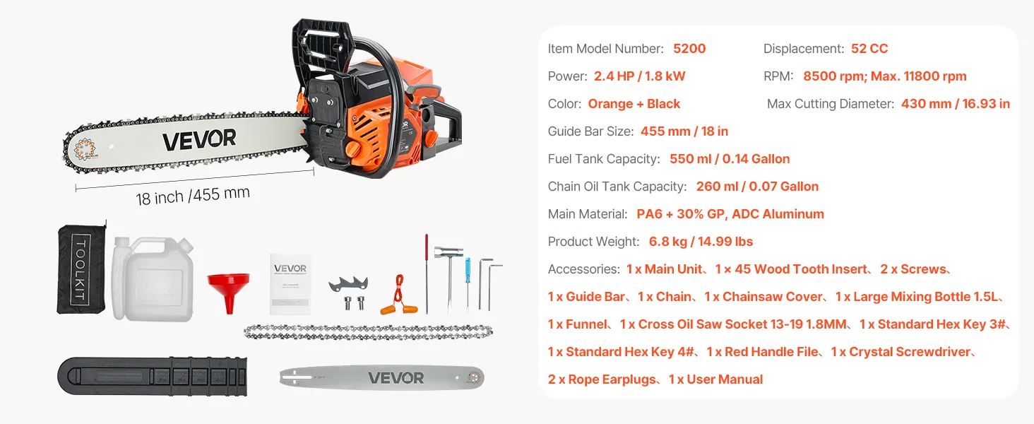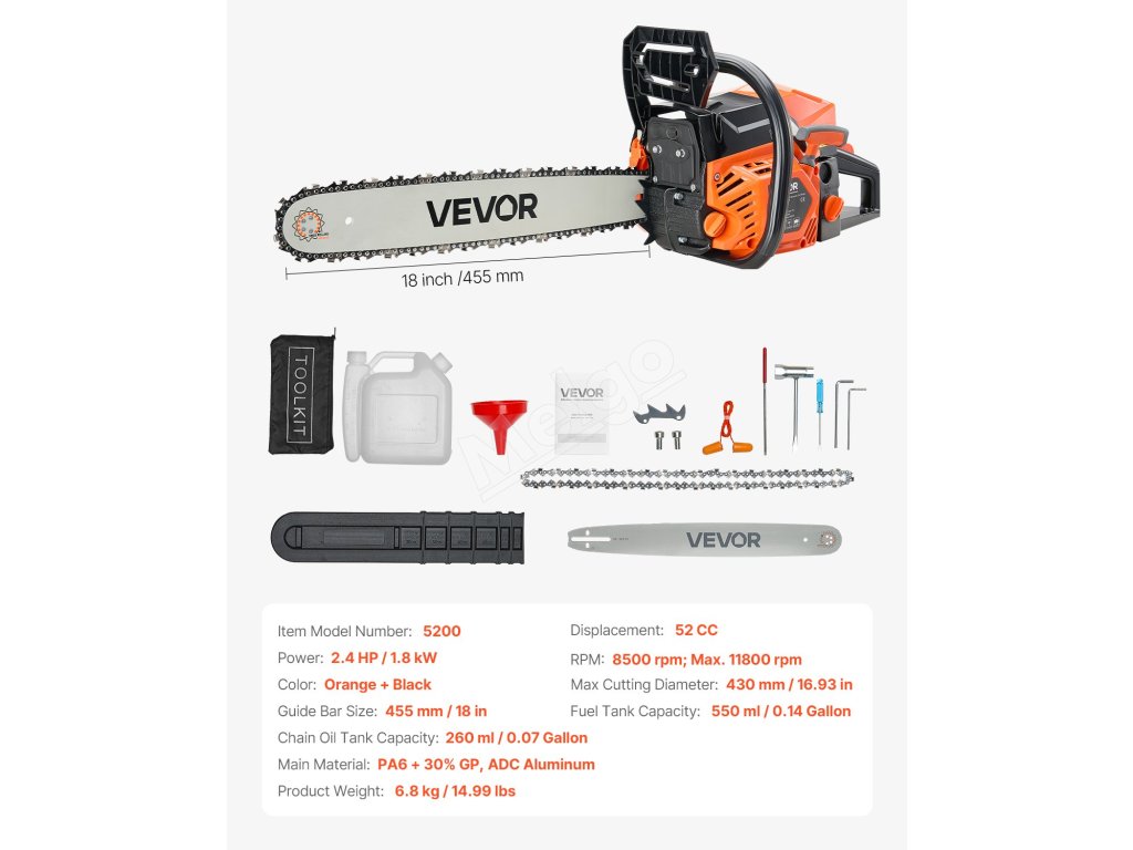 Benzínová reťazová píla 52 cc, 18 inch, 2.4 hp, protišmyková rukoväť