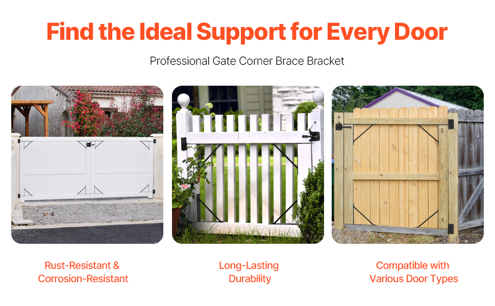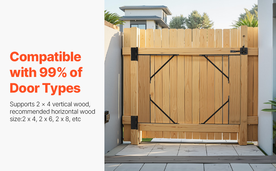 Kompatibilná s 99 % typov brán vrátane brán do prístreškov, príjazdových brán, brán pre hospodárske zvieratá, drevených okien, dverí na terasu, bazénových brán, dverí do stodoly a ďalších. Táto súprava kovania rámu brány sa hodí na drevo s rozmermi 2 x 4 palce a väčšími rozmermi, čím poskytuje univerzálne riešenie pre rôzne inštalácie brán.