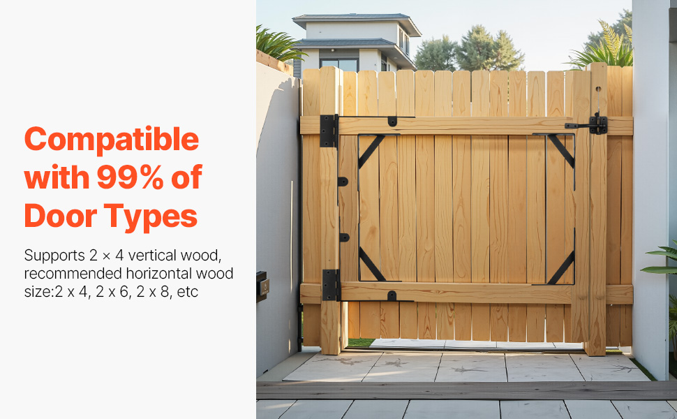 Kompatibilná s 99 % typov brán vrátane brán do prístreškov, príjazdových brán, brán pre hospodárske zvieratá, drevených okien, dverí na terasu, bazénových brán, dverí do stodoly a ďalších. Táto súprava kovania rámu brány sa hodí na drevo s rozmermi 2 x 4 palce a väčšími rozmermi, čím poskytuje univerzálne riešenie pre rôzne inštalácie brán.