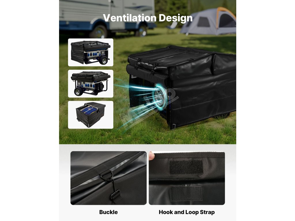 Bočné chlopne sa zrolujú a zaistia pomocou popruhov s háčikmi a prackami, čo umožňuje optimálne prúdenie vzduchu a odvod tepla. Kryt na chod generátora udržiava váš generátor v chlade a efektívne funguje, čím sa predlžuje jeho životnosť.