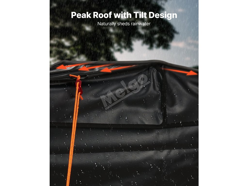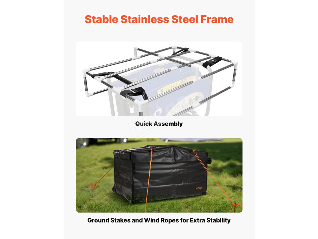 Rám je vybavený rúrkami z nehrdzavejúcej ocele a PVC spojmi, ktoré zabezpečujú trvanlivosť a odolnosť voči nárazom. Popruhy s háčikmi a slučkami pevne zabezpečujú prenosný kryt generátora na mieste, zatiaľ čo kolíky do zeme a laná proti vetru dodávajú dodatočnú stabilitu proti vetru.