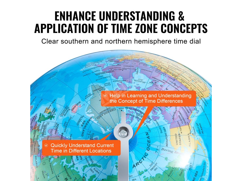 Náš vzdelávací glóbus obsahuje časové ciferníky pre severnú aj južnú pologuľu, ktoré poskytujú jasný a intuitívny spôsob pochopenia časových pásiem. Otáčaním časového ciferníka do príslušnej polohy sa môžete rýchlo naučiť aktuálny čas v rôznych častiach sveta.