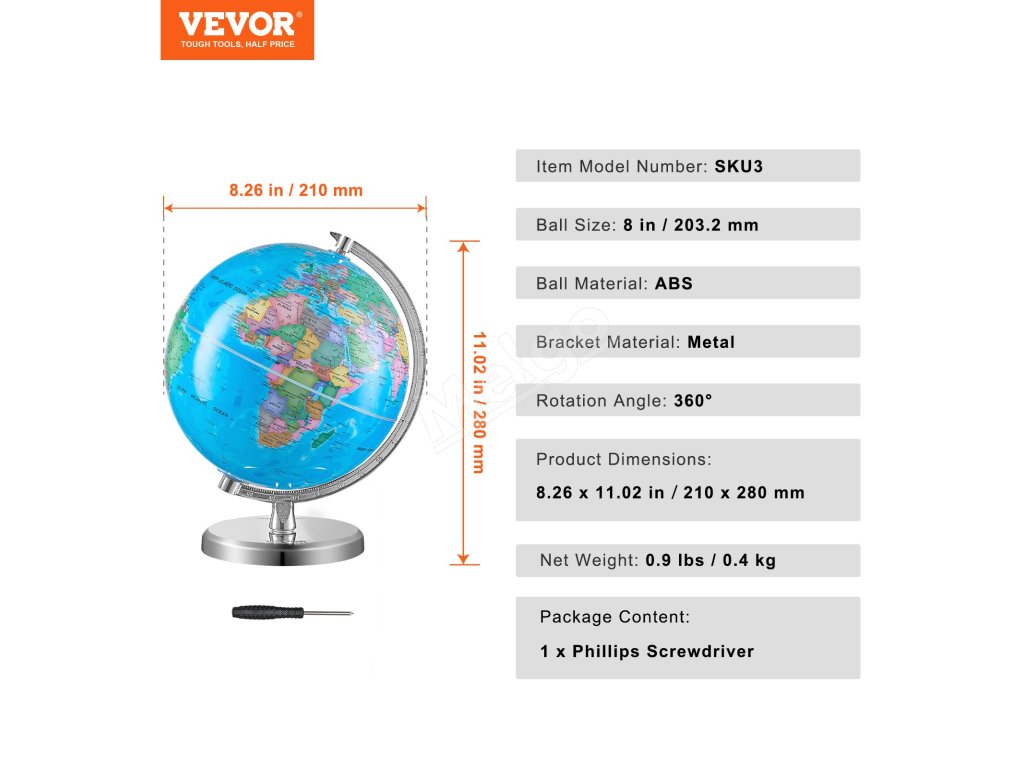 Náš glóbus s priemerom 8 palcov /203,2 mm zobrazuje mapu a hranice sveta s úžasnými detailmi. Vďaka tlači s vysokým rozlíšením, ktorá zaručuje jasné hranice a štítky, môžu deti vizuálne skúmať svetové krajiny, hlavné mestá, morské prúdy, jazerá a čiary zemepisnej šírky a dĺžky. Pokrýva všetky vzdelávacie potreby!