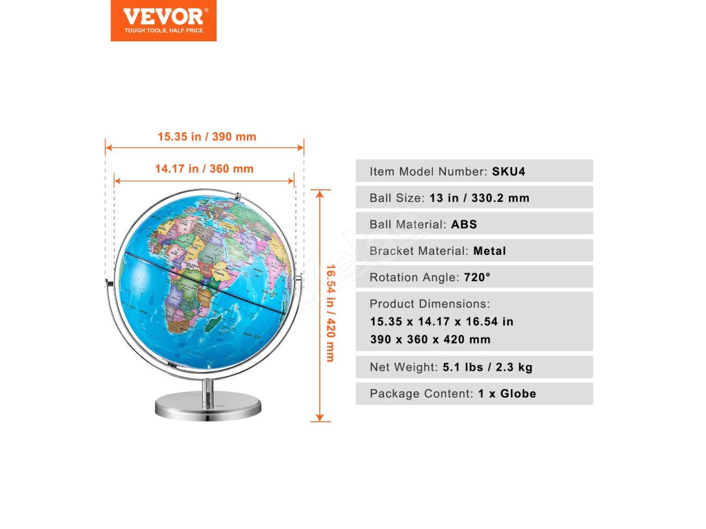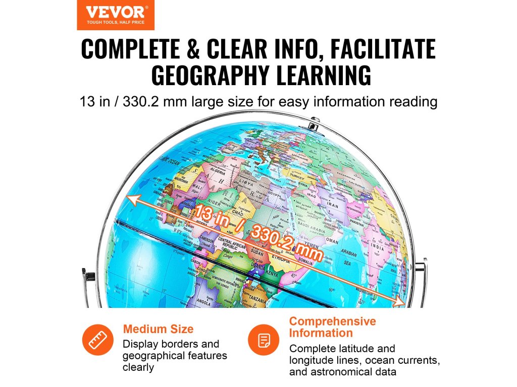 Náš 13-palcový/330,2 mm glóbus zobrazuje mapu a hranice sveta s úžasnými detailmi. Vďaka tlači s vysokým rozlíšením, ktorá zaručuje jasné hranice a štítky, môžu deti vizuálne skúmať svetové krajiny, hlavné mestá, morské prúdy, jazerá a čiary zemepisnej šírky a dĺžky. Pokrýva všetky vzdelávacie potreby!
