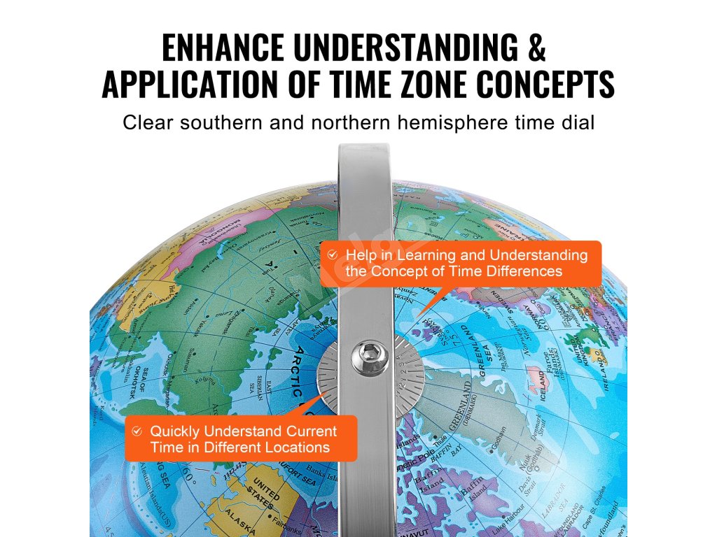Náš vzdelávací glóbus obsahuje časové ciferníky pre severnú aj južnú pologuľu, ktoré poskytujú jasný a intuitívny spôsob pochopenia časových pásiem. Otáčaním časového ciferníka do príslušnej polohy sa môžete rýchlo naučiť aktuálny čas v rôznych častiach sveta.