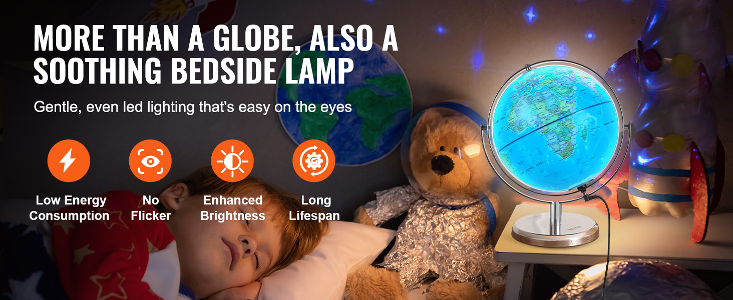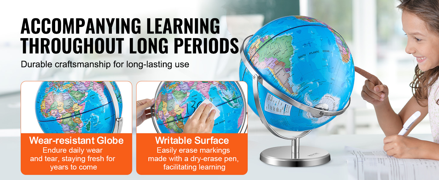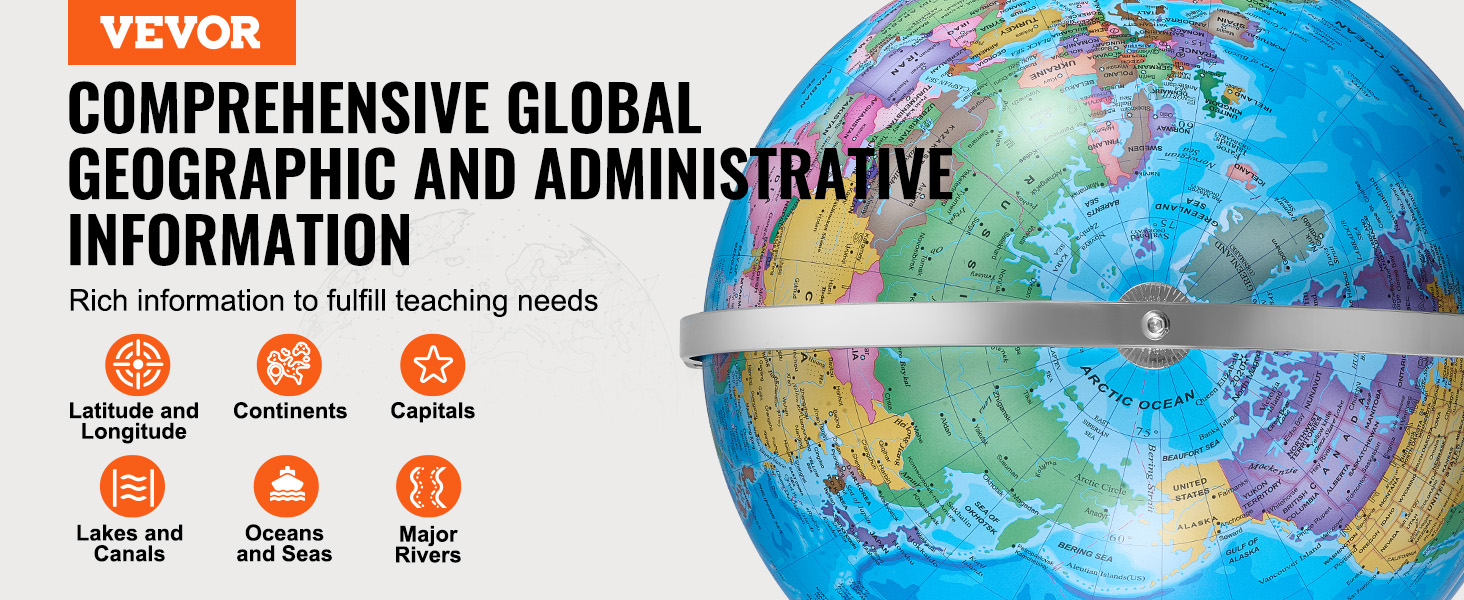 Náš 13-palcový/330,2 mm glóbus zobrazuje mapu a hranice sveta s úžasnými detailmi. Vďaka tlači s vysokým rozlíšením, ktorá zaručuje jasné hranice a štítky, môžu deti vizuálne skúmať svetové krajiny, hlavné mestá, morské prúdy, jazerá a čiary zemepisnej šírky a dĺžky. Pokrýva všetky vzdelávacie potreby!