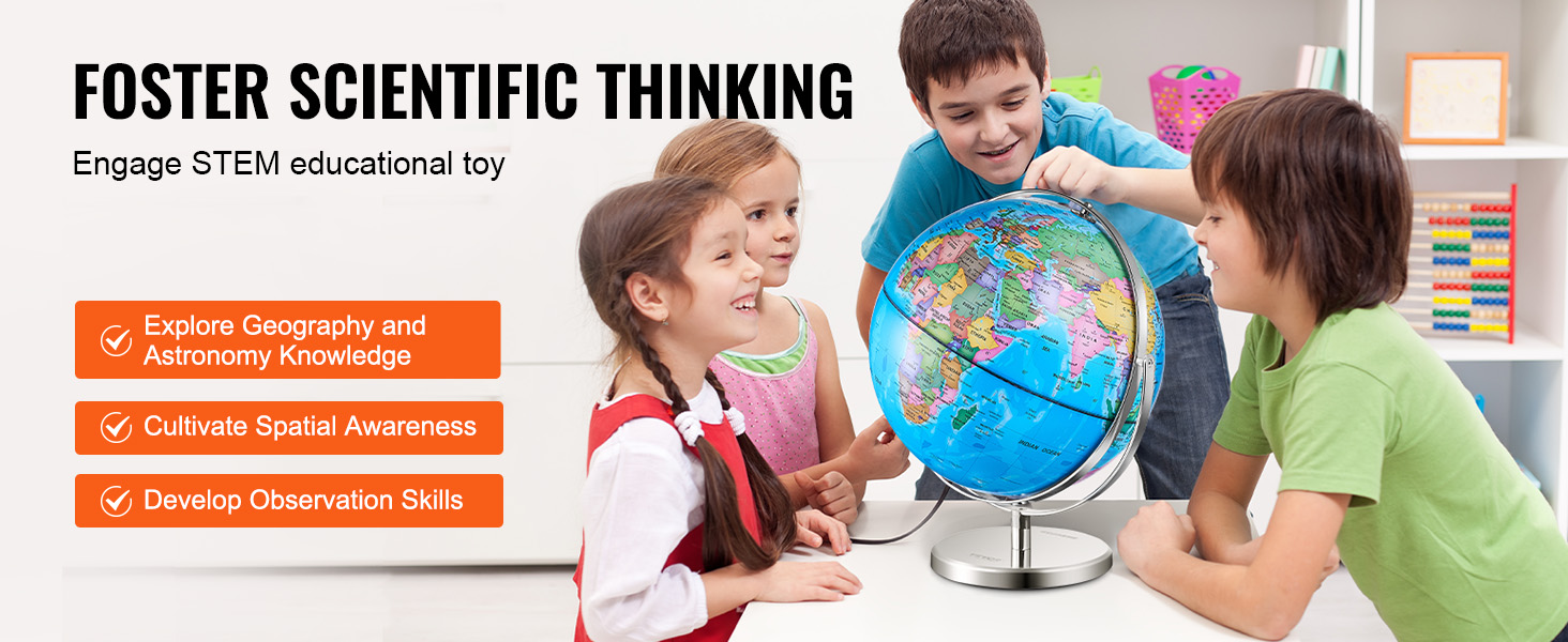 Tento pútavý glóbus je ideálny na zoznámenie detí so zázrakmi geografie. Jeho viacsmerové otáčanie zlepšuje priestorové povedomie a rozširuje ich obzory. Skúmaním geografických aj astronomických poznatkov tento glóbus pomáha rozvíjať vedecké myslenie mladých ľudí.