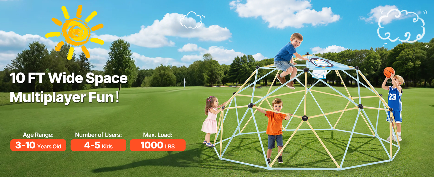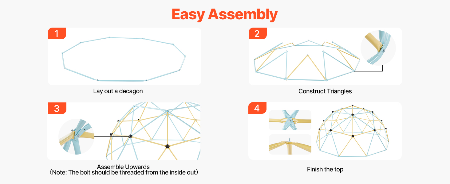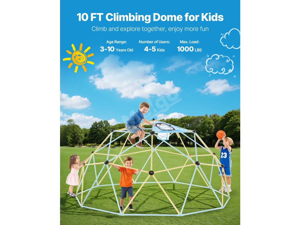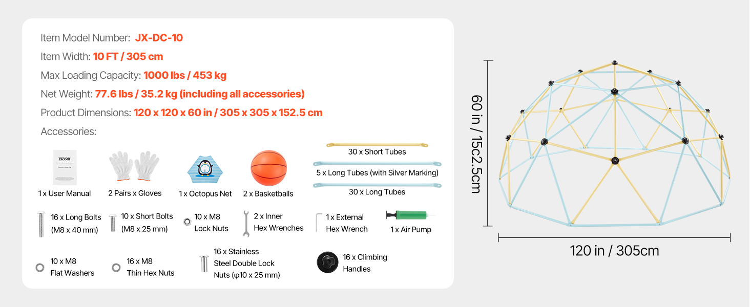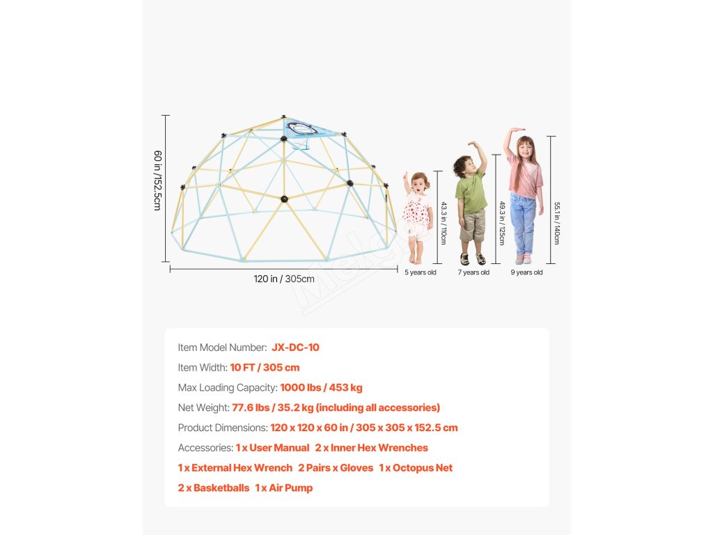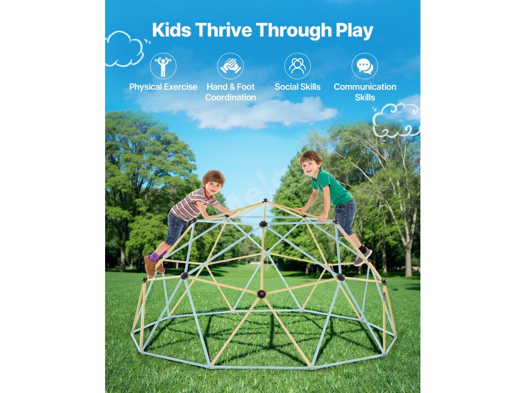 Naše lezecké zariadenie s geometrickou kupolou sa dodáva s rukavicami, kľúčmi a podrobným návodom na použitie. Dve osoby ho môžu rýchlo zostaviť, čím v niekoľkých krokoch vytvoria pre vaše deti ihrisko plné zábavy.