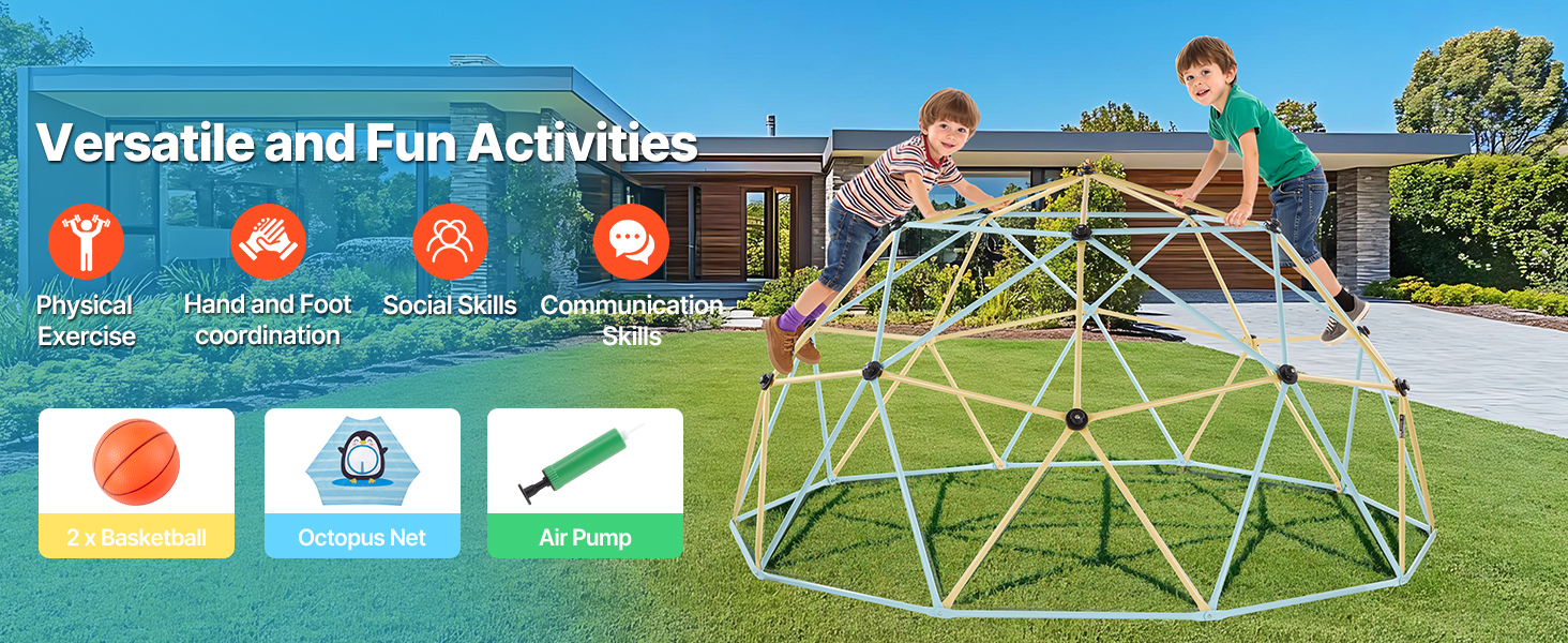 Pokračujte v zábave vďaka všestrannej hre! Táto hracia súprava s lezeckou kupolou obsahuje aj 2 basketbalové lopty, sieť na chobotnicu a vzduchovú pumpu, ktoré zvyšujú zábavu a vzrušenie. Obľúbené ihrisko pre deti počas víkendových párty a susedských stretnutí.