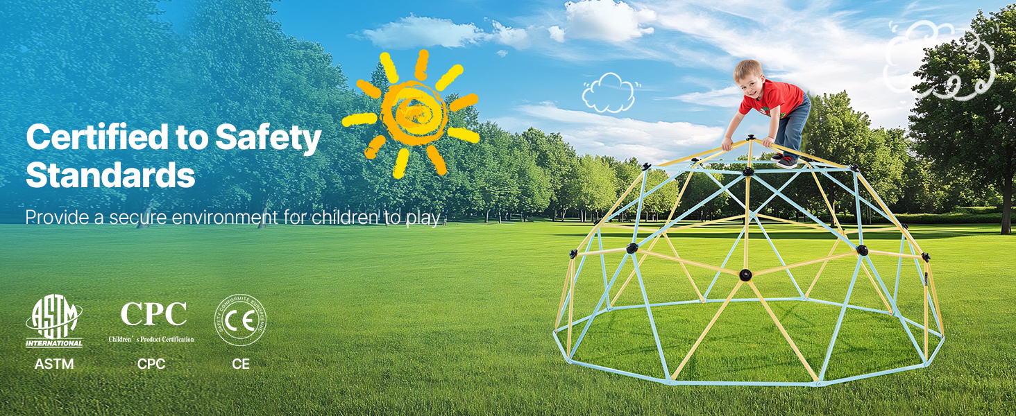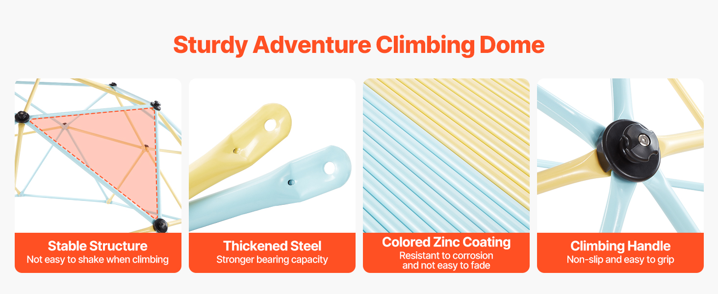 Vďaka tomu, že každé lezenie je bezpečné a zábavné, má naša detská kopulovitá preliezačka stabilnú trojuholníkovú konštrukciu, ktorá počas hry zostáva stabilná. Zhrubnuté oceľové rúrky zvyšujú nosnosť, farebný zinkový náter odoláva hrdzi a vyblednutiu a protišmykové rukoväte na lezenie ponúkajú bezpečné uchopenie.