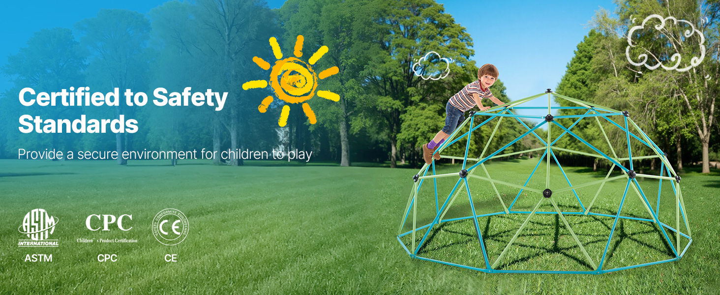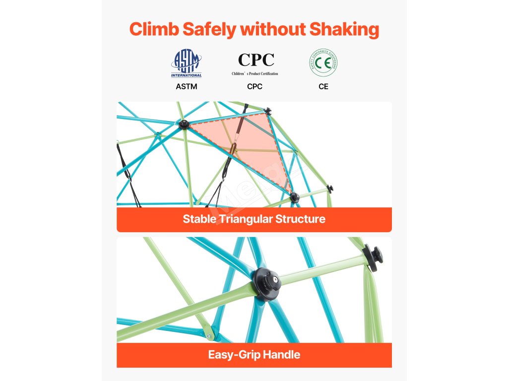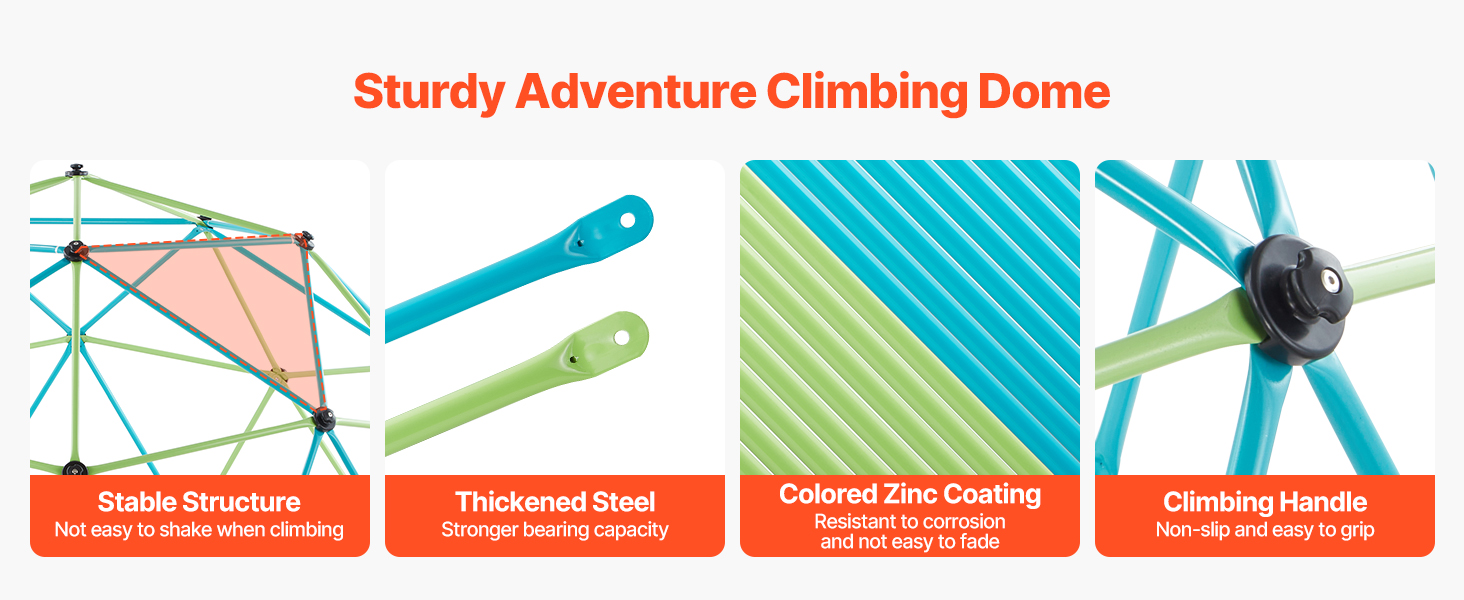 Vďaka tomu, že každé lezenie je bezpečné a zábavné, má naša detská kopulová preliezačka stabilnú trojuholníkovú konštrukciu, ktorá počas hry zostáva stabilná. Zhrubnuté oceľové rúrky zvyšujú nosnosť, farebný zinkový náter odoláva hrdzi a vyblednutiu a protišmykové rukoväte na lezenie ponúkajú bezpečné uchopenie.