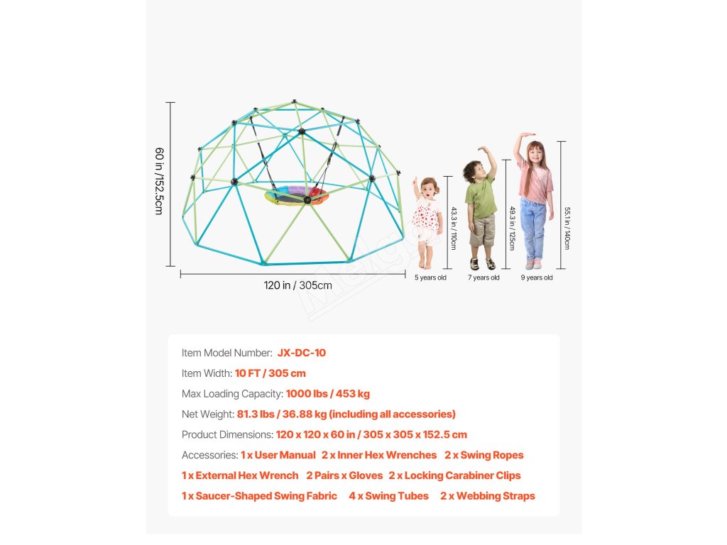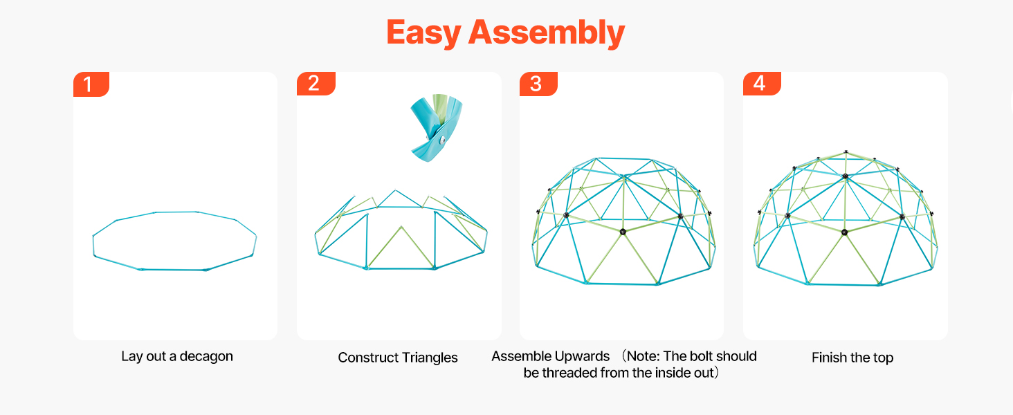 Naše lezecké zariadenie s geometrickou kupolou sa dodáva s rukavicami, kľúčmi a podrobným návodom na použitie. Dve osoby ho môžu rýchlo zostaviť, čím v niekoľkých krokoch vytvoria pre vaše deti ihrisko plné zábavy.
