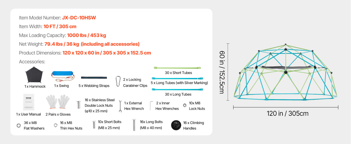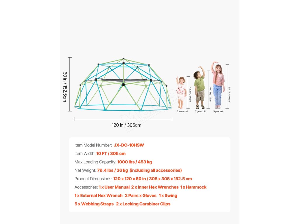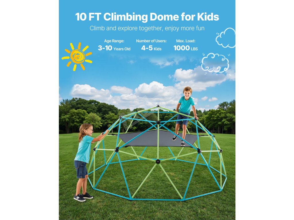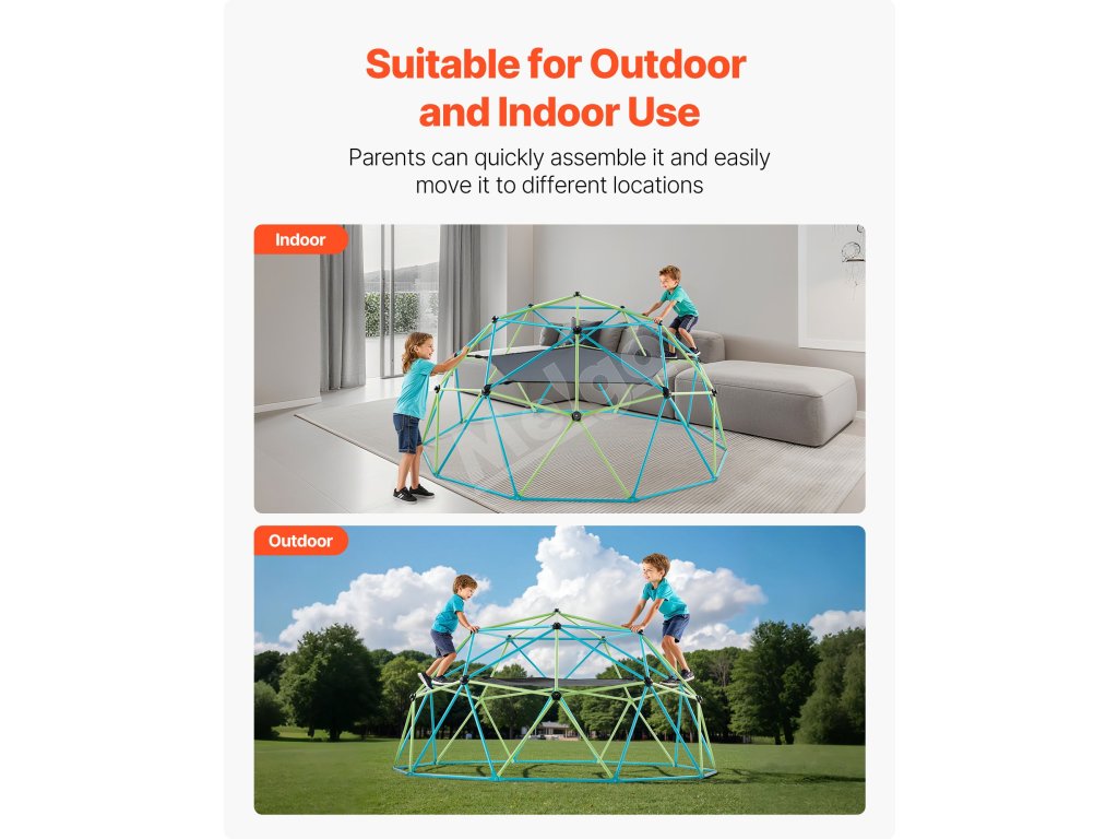 Naše lezecké zariadenie s geometrickou kupolou sa dodáva s rukavicami, kľúčmi a podrobným návodom na použitie. Dve osoby ho môžu rýchlo zostaviť, čím v niekoľkých krokoch vytvoria pre vaše deti ihrisko plné zábavy.